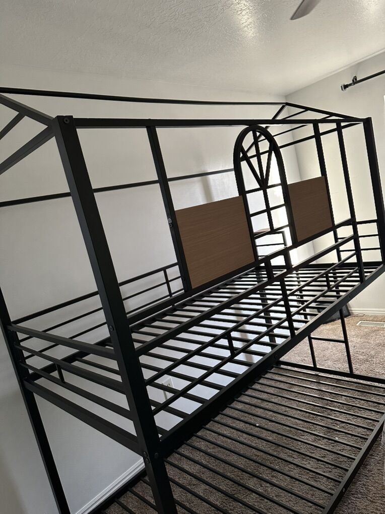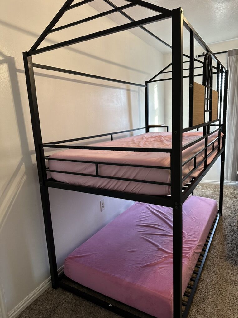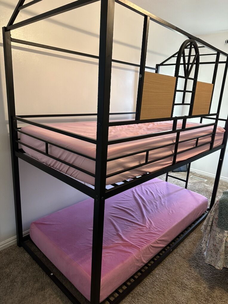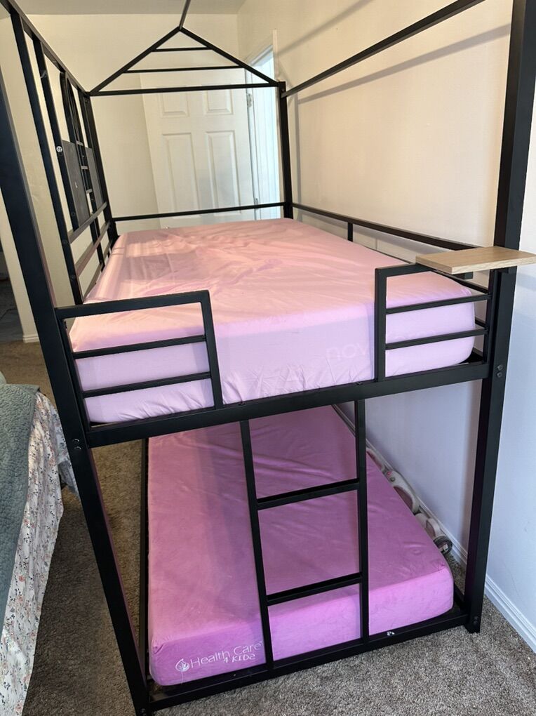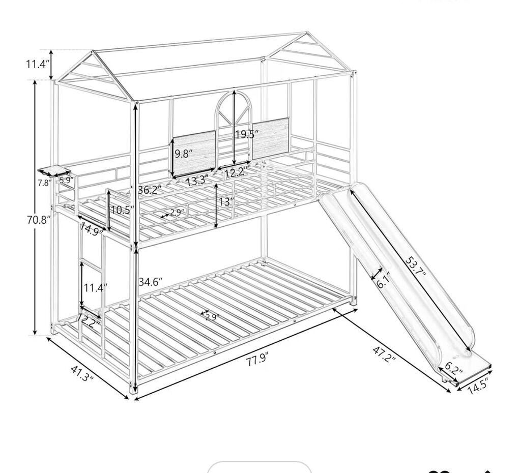 ApplePayThe twin/twin bunk is perfect for families.Full-length guardrails on the upper bunk prevent accidental falls. Bed comes with full-length guardrails, built-in ladders and secured metal slats that do not require foundation. Some assembly is required, Overall Product Dimension:77.9L x 41.3W x82.2H