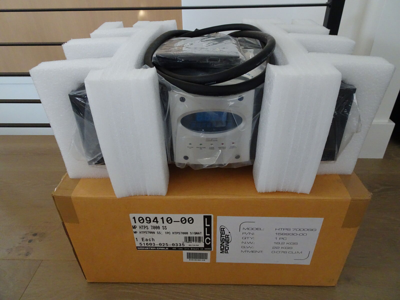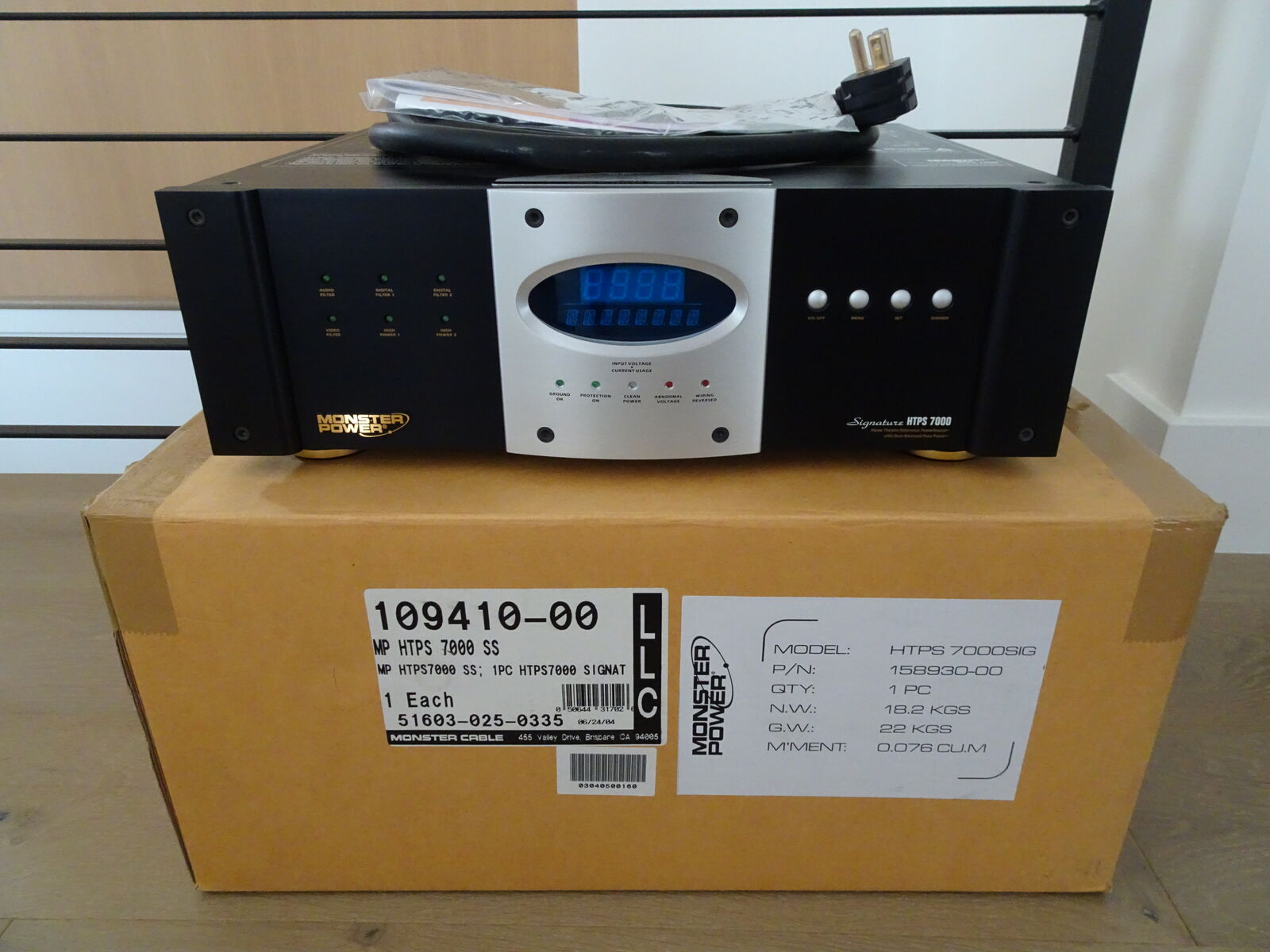 This massive power conditioner / surge protector weighs about 50 lbs. It includes the original box and packaging, the original double box (as shown in pictures), manual and label stickers, the original cables (the Remote AC Control Cord and the 1/8" mini-plug mono cable for 12V trigger) and the original extra fuses.