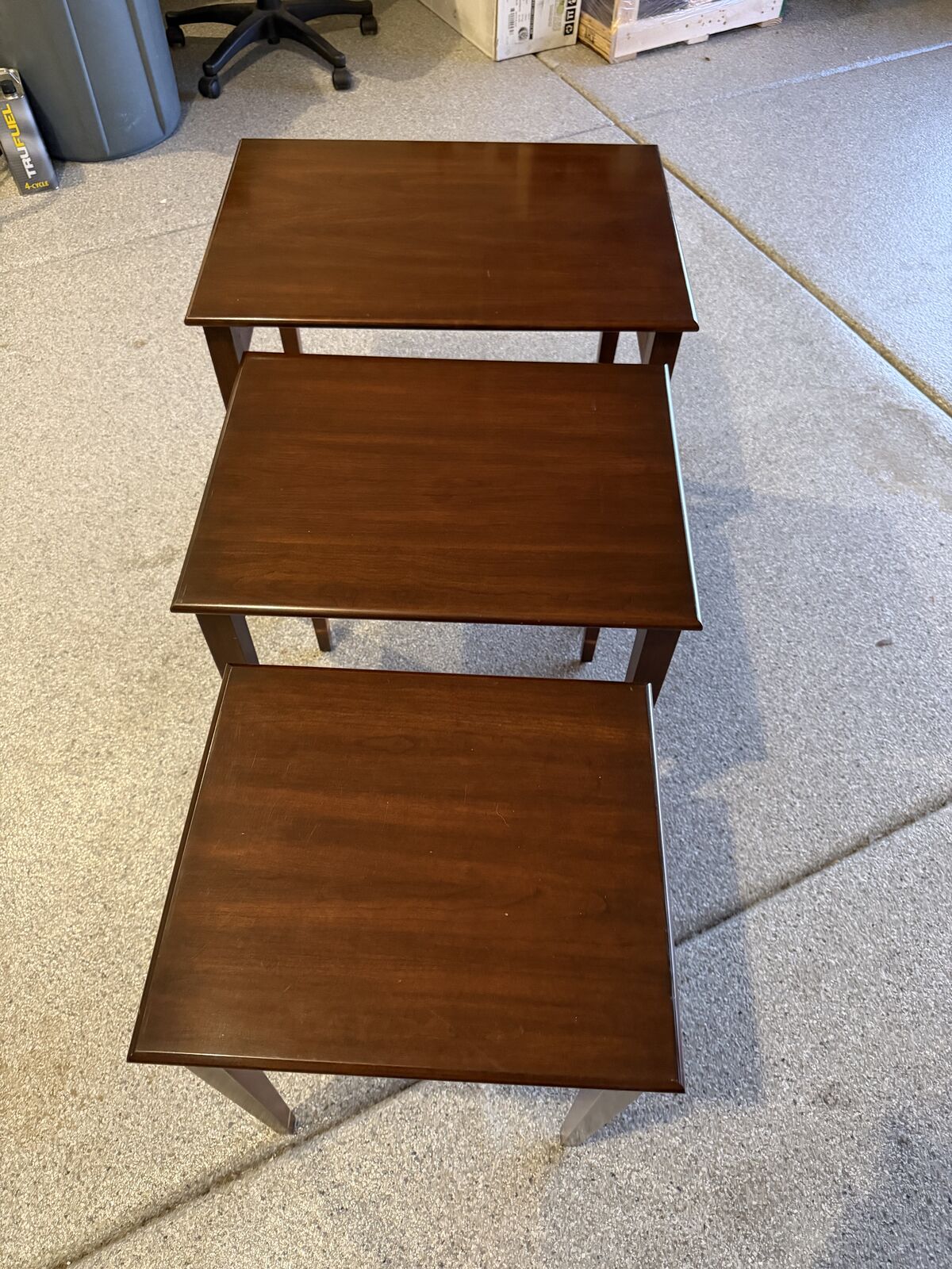ZelleSet of 3 coffee tables that are designed to be stored as one. Please see the pictures, it is a beautiful and expensive set. Just don't have room right now.