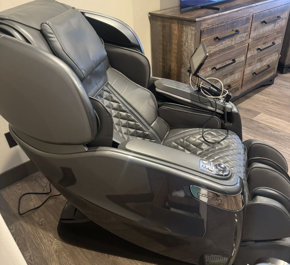 +6 The Cozzia Qi XE Pro (available in Gray, CZ-716-9090) is a luxury, AI-powered 4D massage chair featuring 23+ automatic programs, Tri-Zone heat therapy, and advanced L-track rollers from neck to glutes. Key options include a 7-inch touchscreen, voice control, 64 airbags, specialized knee/calf massage, and, on some models, a biometric scanner for custom, AI-driven Chair Doctor™ therapy. Key Features and Options List: Massage Technology: 4D VarioMotion™ intelligent rollers with 6 unique techniques and a 54-inch L-track. AI Customization: Chair Doctor AI technology, 23-25+ auto programs, and biometric scanner for health tracking. Heat Therapy: Tri-Zone heat targeting the lower back, seat, knees, and calves. Targeted Massage: Dedicated calf, knee, and foot reflexology rollers. Controls: 7-inch wired touch-screen tablet (supports multiple languages) and armrest quick-action controls. Comfort & Convenience: Zero Gravity recline, wall-hugging space-saving design, Bluetooth speakers, and USB-C charging port.