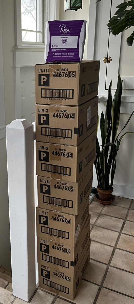 26 packages of Poise daily liners, almost all of them in unopened boxes. Very Light, Long. At amazon’s normal price per box of $25 (four per box), these would be worth $162.