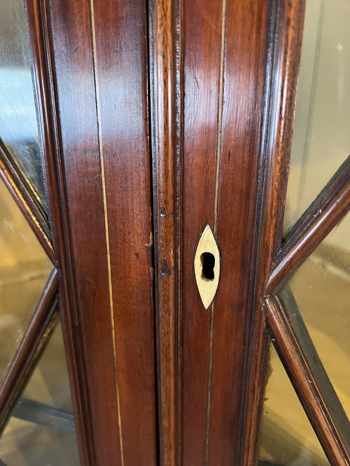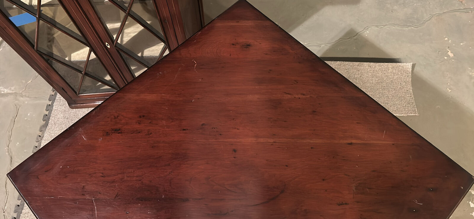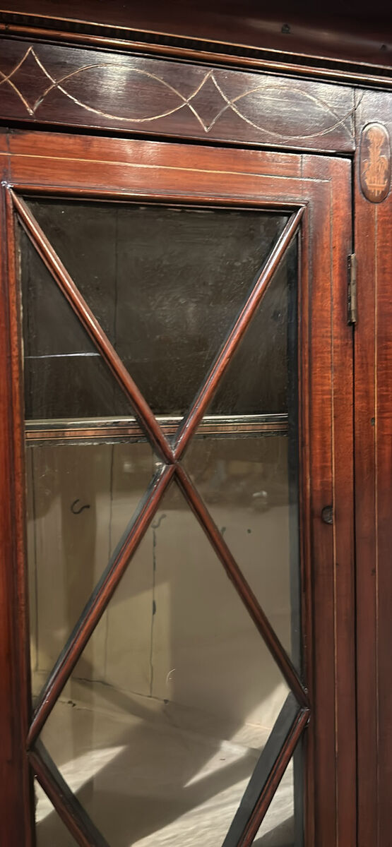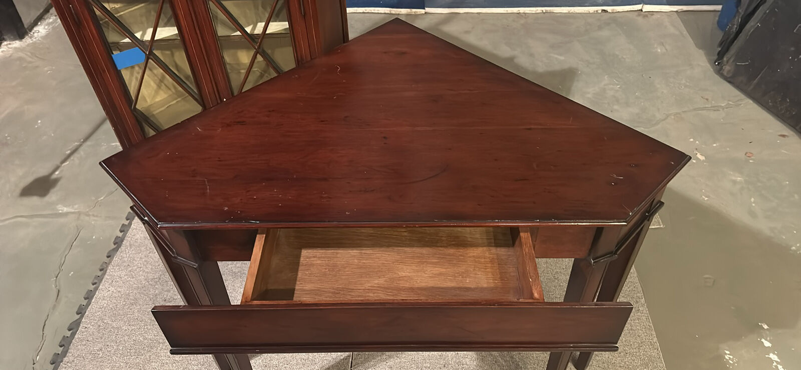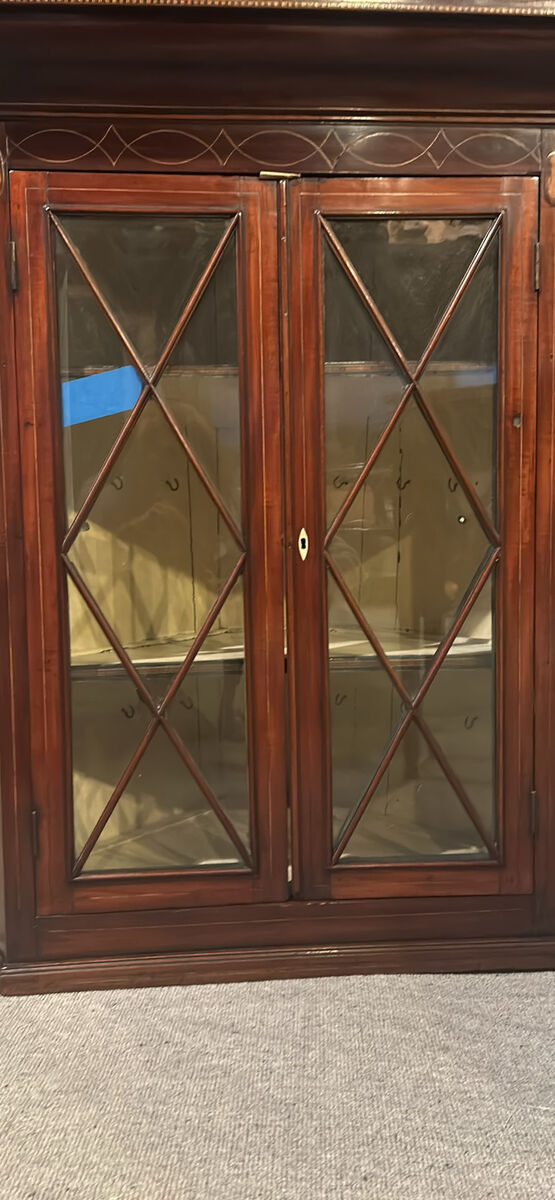 ZelleAntique cherry wood glass front cabinet and matching desk with 1 drawer.