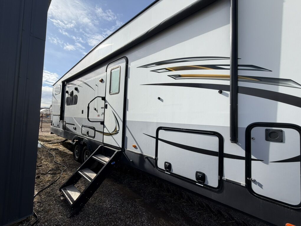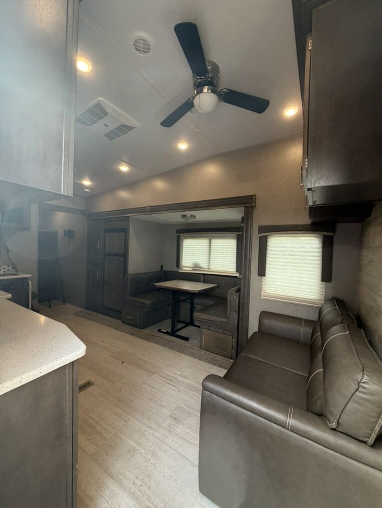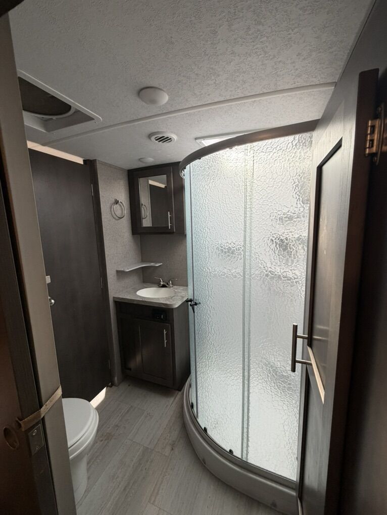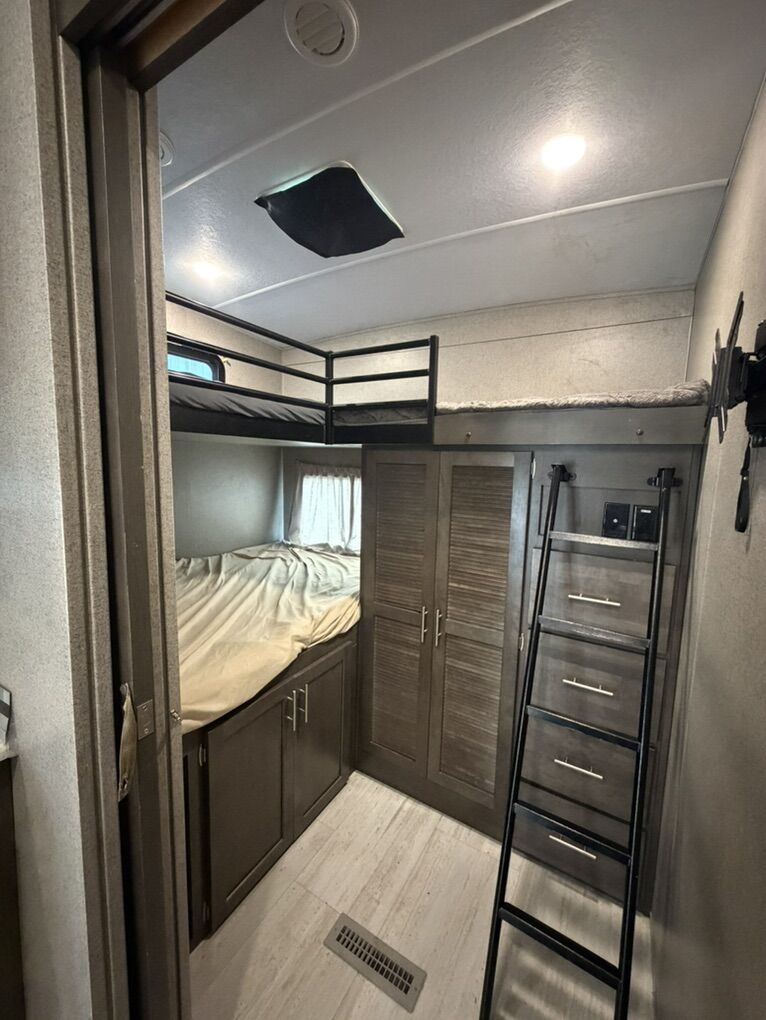 Queen bed master suite Twin over full bunk room with tons of storage Two slide outs(spacious bunkhouse layout) Solid surface countertops + pantry Outdoor speakers, outdoor grill & mini fridge Large awning (~20 ft) Electric front jack & rear stabilizers Wired for solar & backup camera
