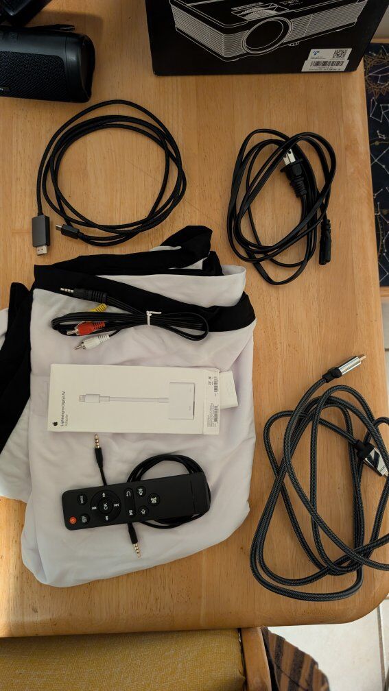 VenmoMini Projector with HDMI cable and HDMI Adapters (iPhone and android) Includes: -Projector -Projector Screen -HDMI cable -USB-C to HDMI adapter -Lightning Cable to HDMI/USB-C adapter -AV cables -Aux Cord -Remote Only used once. Like new condition.