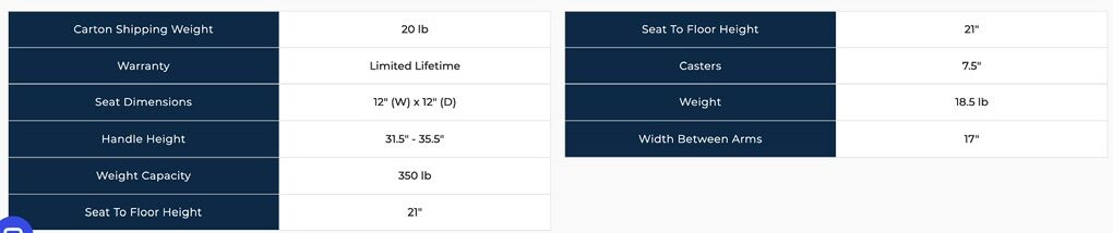 Product Specifications • Actual Product Weight: 13 lbs • Handle Height (Max): 37 • Handle Height (Min): 32 • Overall Product Height: 32 • Overall Product Length: 27.5 • Overall Product Width: 24.5 • Primary Product Color: Black • Primary Product Material: Aluminum • Product Weight Capacity: 300 lbs • Seat Depth: 14 • Seat Width: 12 • Seat to Floor Height: 20 • Warranty: Limited Lifetime