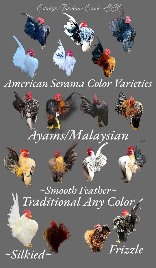 PayPal*Pair- Both go together SERAMAS are smaller then your average bantam, they are considered as tea cups of the chicken world. Some even keep as house pets. Egg size is slightly larger then a qual egg. There are also different variations in body type: Pet quality (are considered basic bantams) American/Traditional, Malaysian, Extreme's, see pic above. As far as Feathering goes: smooth, frizzled, and silkied (not a mix). Seramas do not breed true as far as coloring. however some breeders will spend years specializing in consistent/perdictable colors & patterns (breed true).