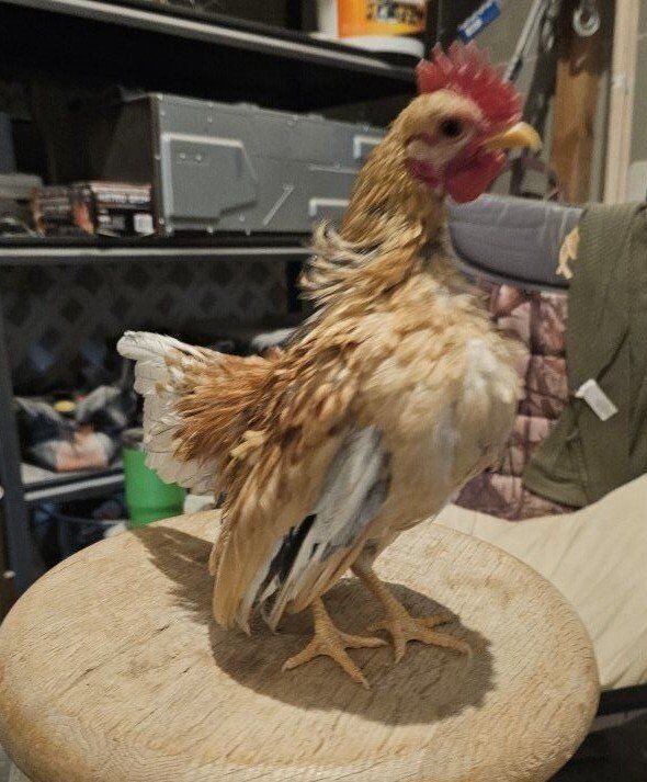 Cockerel 4 Mo. on the smaller side Parents: Rooster - Extreme Malaysian, buff/blue tail line Hen- Malaysian, buff/blue tail line