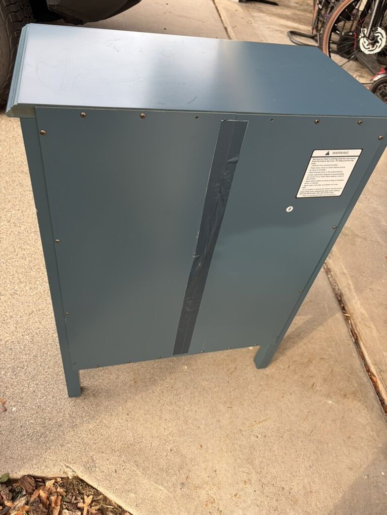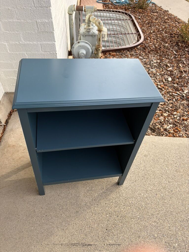 ApplePaySmall blue bookshelf with minor scuffs and scratches.