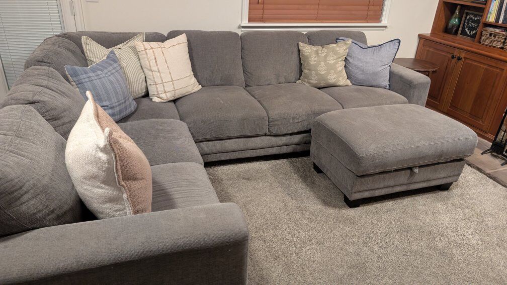 Venmogrey sectional, measures about 115" by 95". it includes storage ottoman, that works to open and close. the couch is in two pieces that link together. the feet are black. smoke free home. we do have pets but they have never sat on it. in good condition, no tears or rips, could use a shampoo job. pillows not included.
