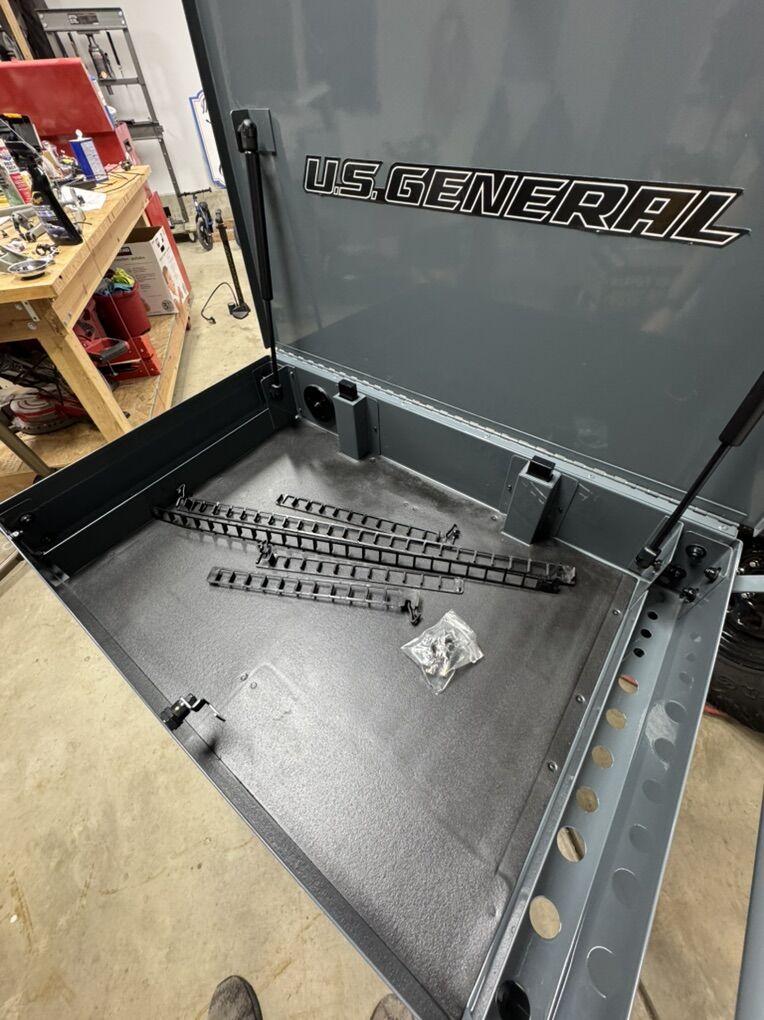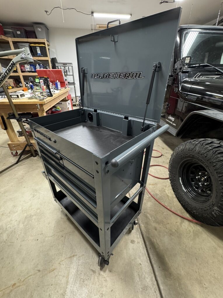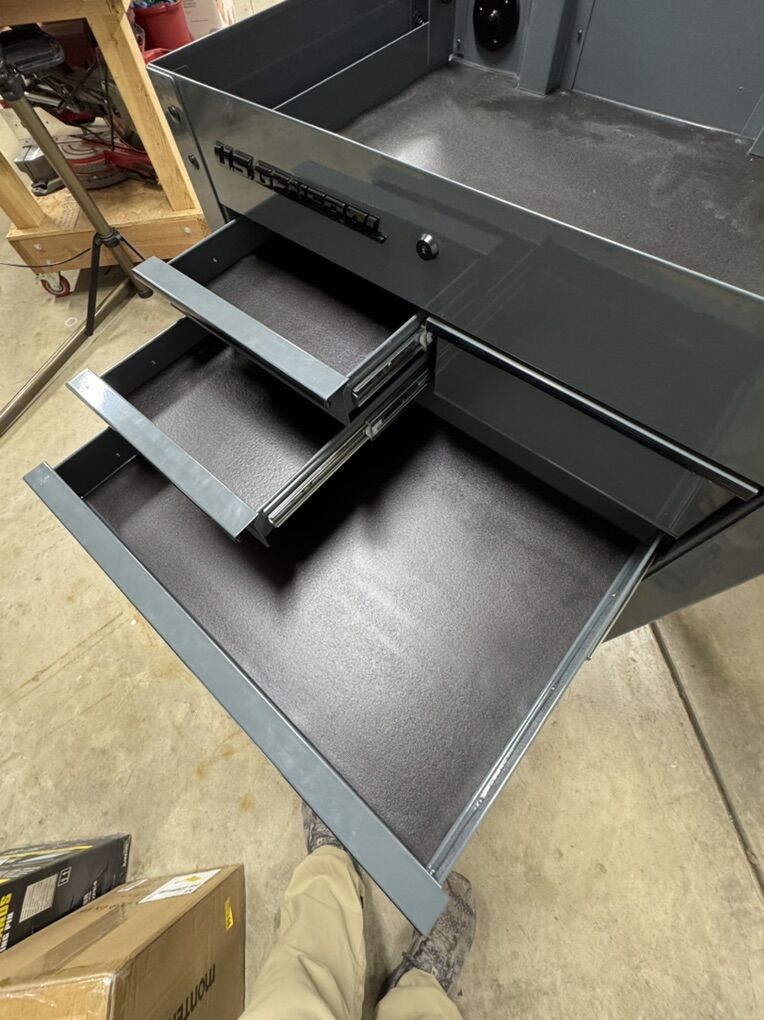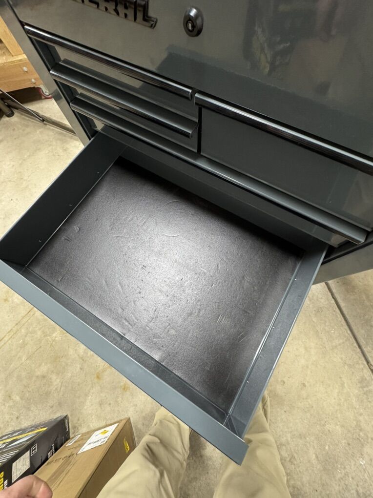 Minimal use, has a few small dings and scuffs as shown in pictures. Includes drawer latch inserts and keys for the lock. Text is Preferred.