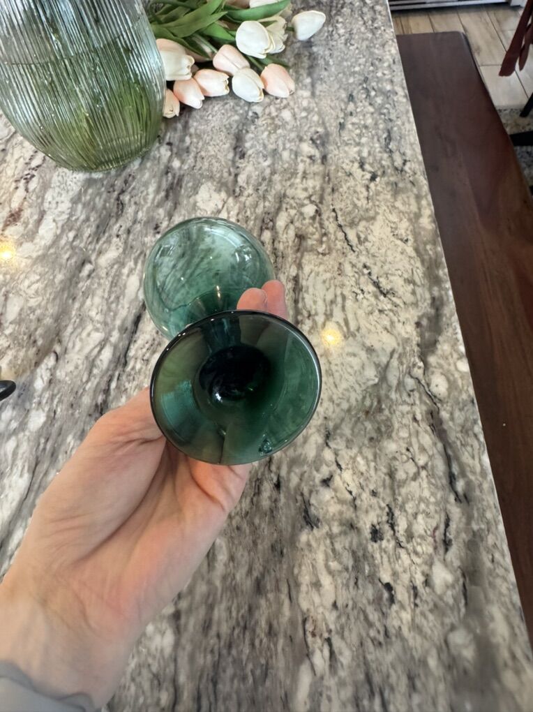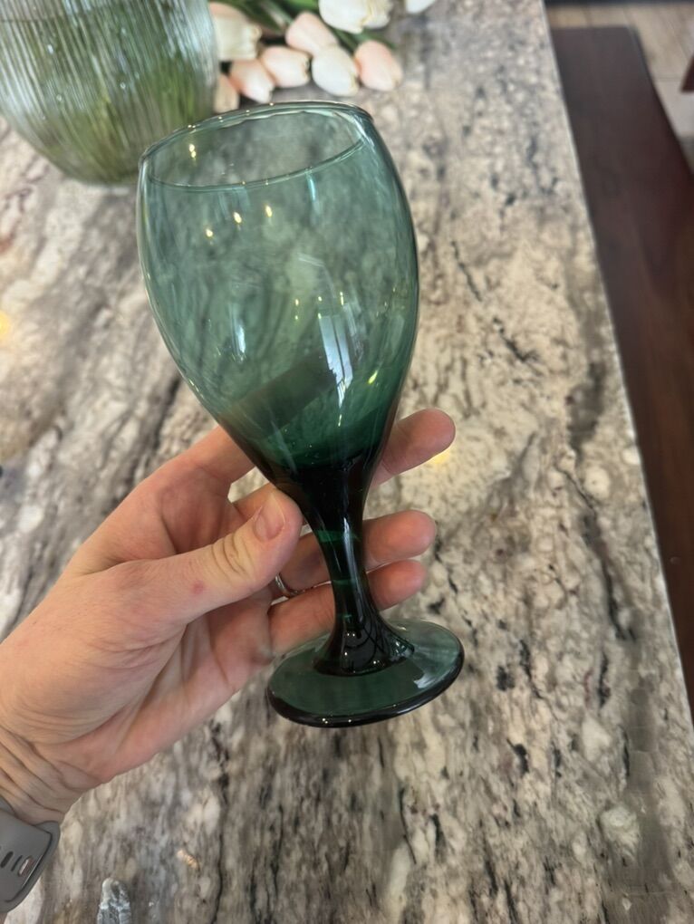 VenmoVintage Smokey Libby glass company goblets. Beautiful Forest green color with gold trim, teardrop shape, set of six. Two of them have the gold trim completely off. $15