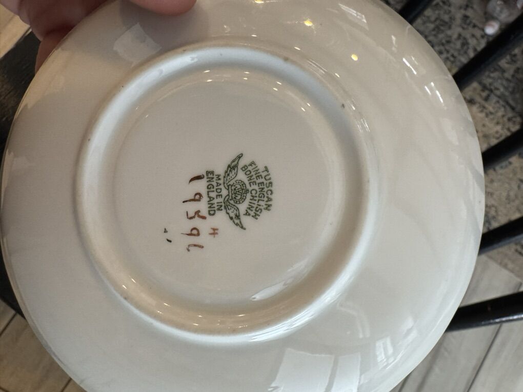 SOLD Bone China saucer very cute floral design with gold detail and blush pink band with ruffle edge $5