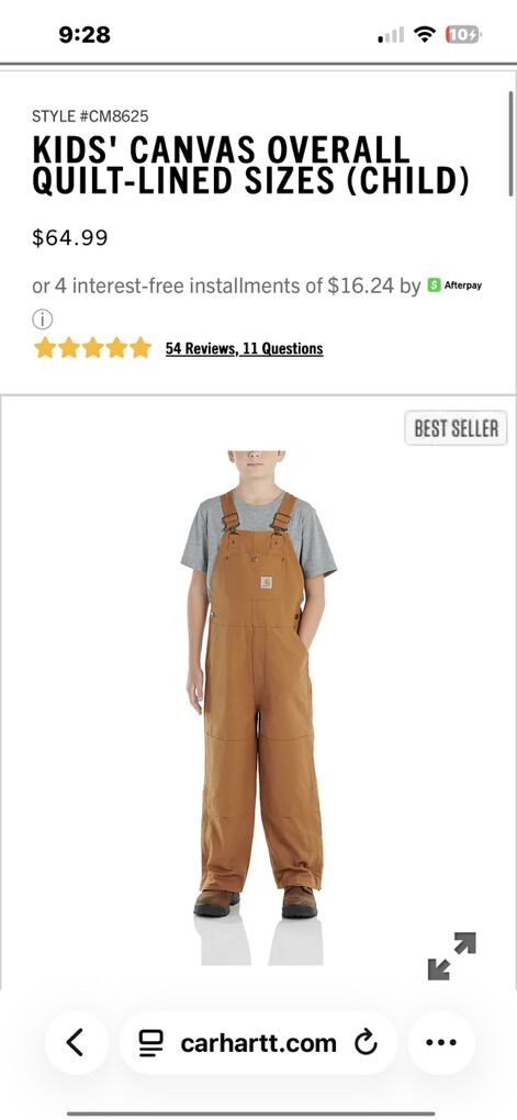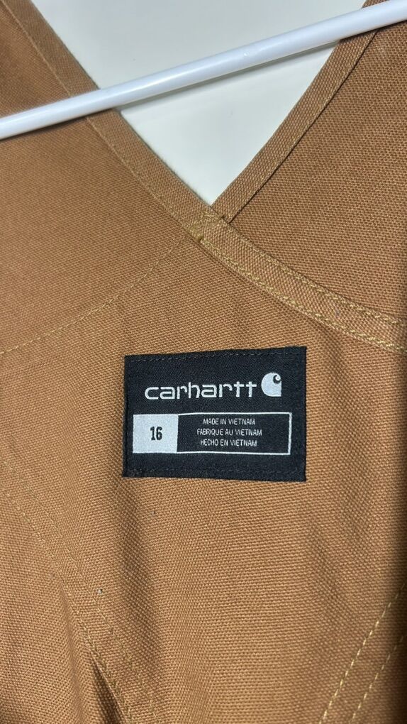 VenmoYouth Carhartt overalls tagged size 16, but they fit bigger — more like an 18. Definitely a roomy/relaxed fit.