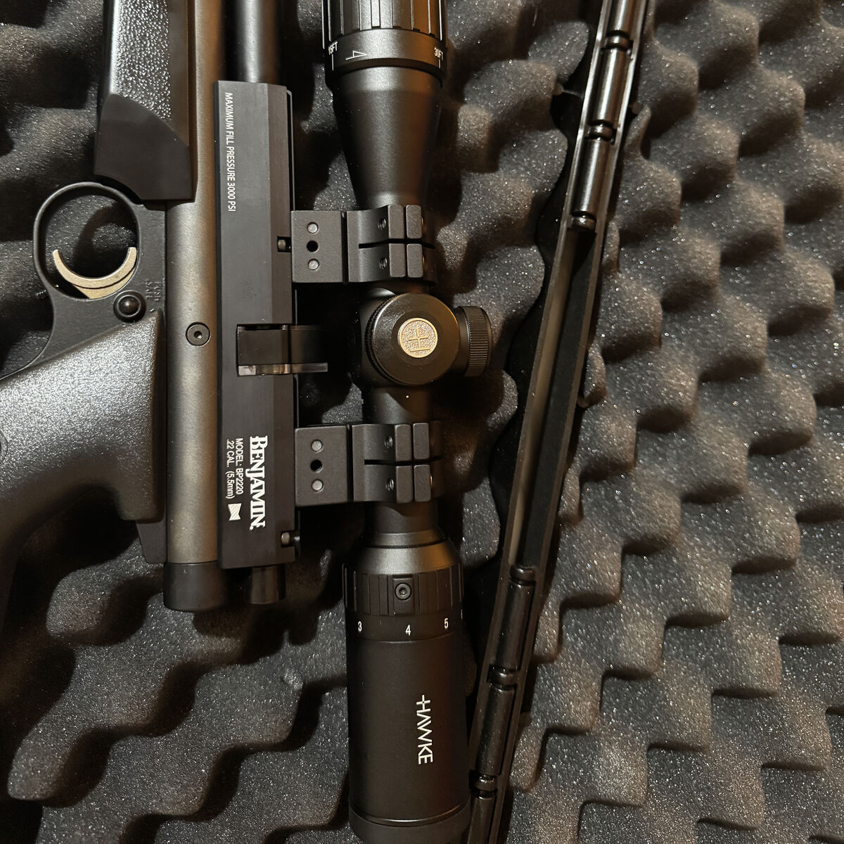 ApplePay.22 caliber Benjamin Marauder (P-Rod) in excellent condition. Scope professionally mounted and sighted in. Shot less than 20 times since purchasing in summer (2025). Hard case and several tins of pellets included. Perfect set up for small game hunting, pest control or backyard plinking (one of the quietest stock PCP rifles on the market). • Benjamin Marauder Pellet Pistol (includes stock extension) • HAWKE Scope: Vantage IR 2-7x32 AO • MTM Case-Gard Carbine Rifle Case • Benjamin Discovery Hollow Point .22 cal, 14.3gr - 500ct