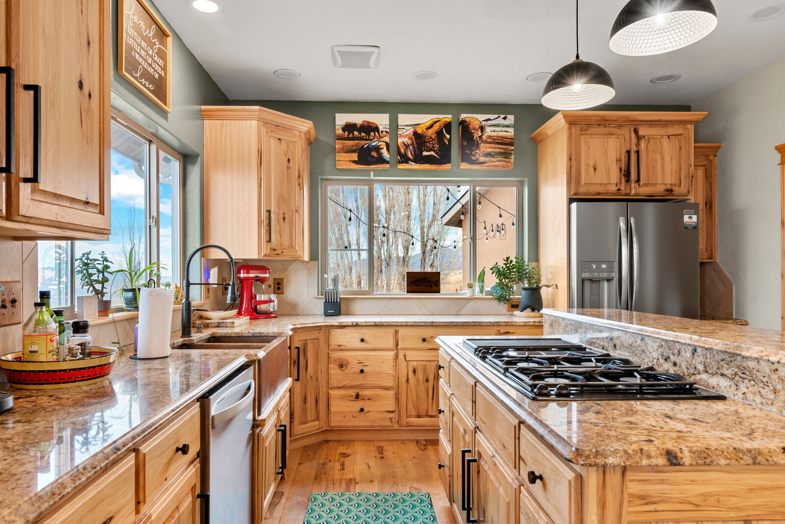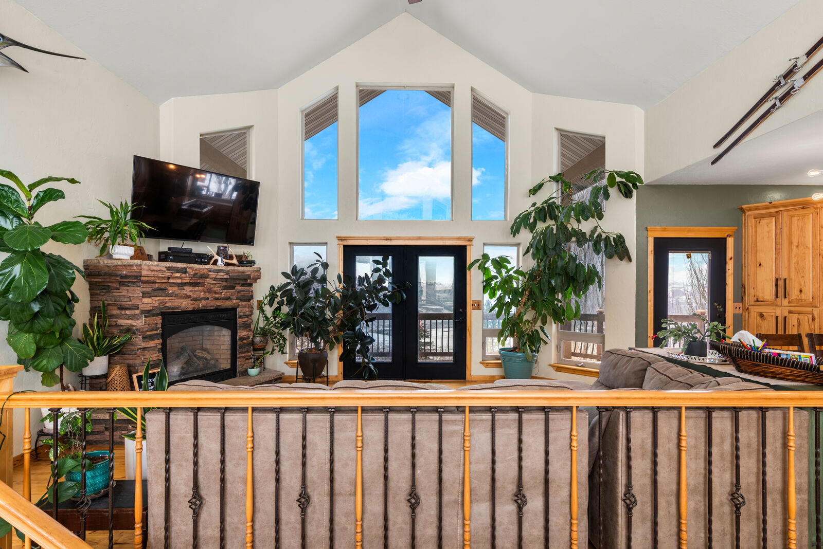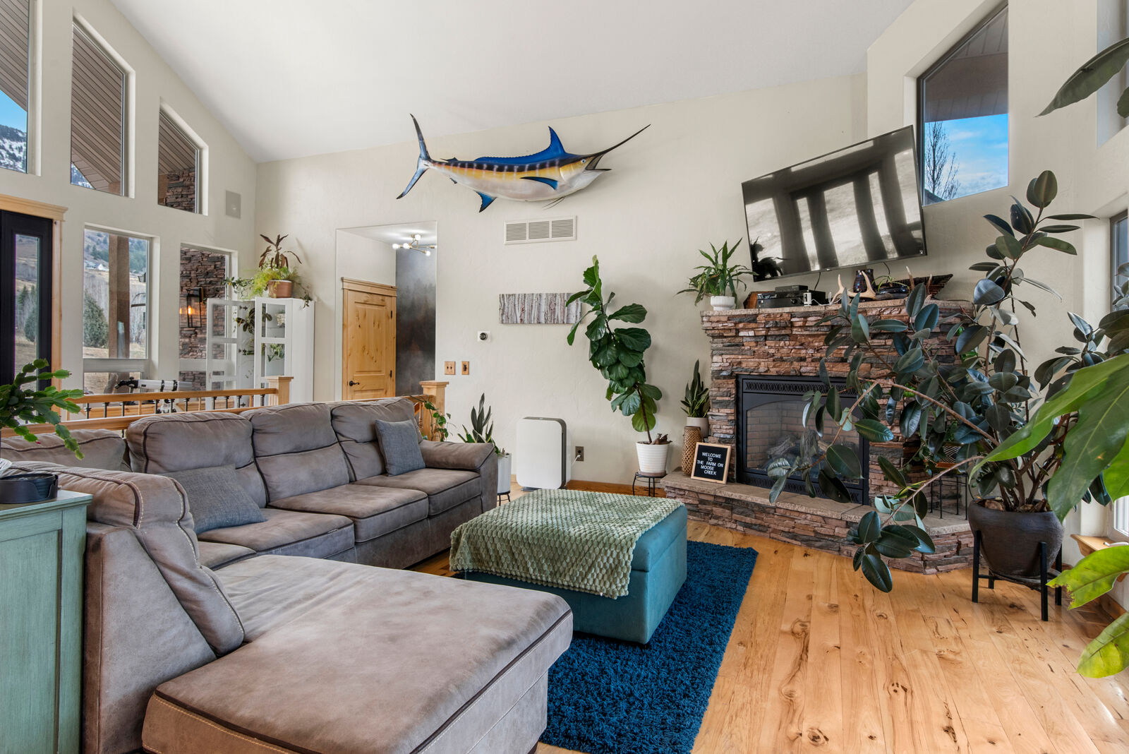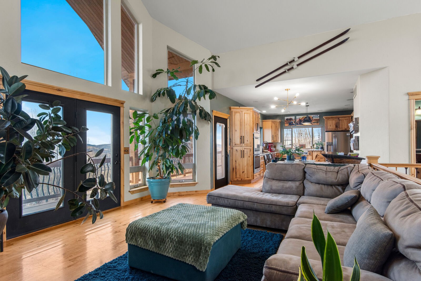 The custom built home is designed to showcase its surroundings, featuring soaring vaulted ceilings, expansive windows, and warm hickory hardwood floors and trim throughout. With 5 bedrooms, 3 bathrooms, a flexible office/exercise space, mudroom, and a spacious three car garage, the layout is ideal for both everyday living and hosting family or guests.
