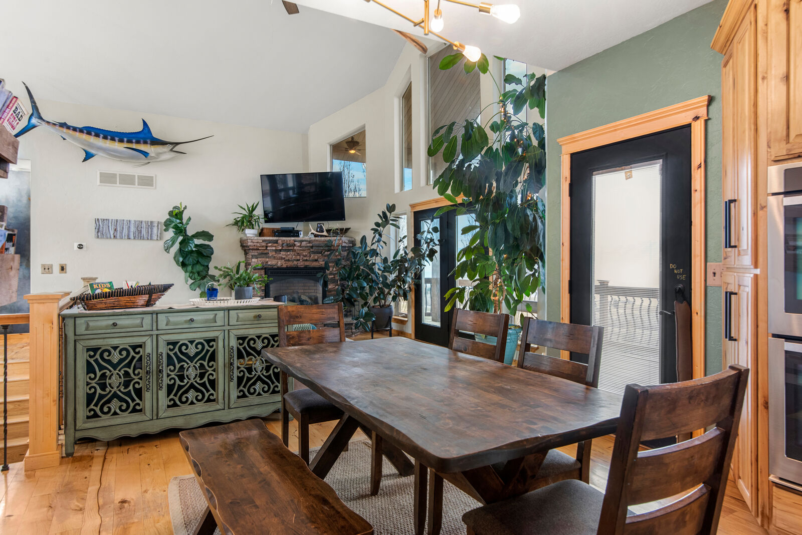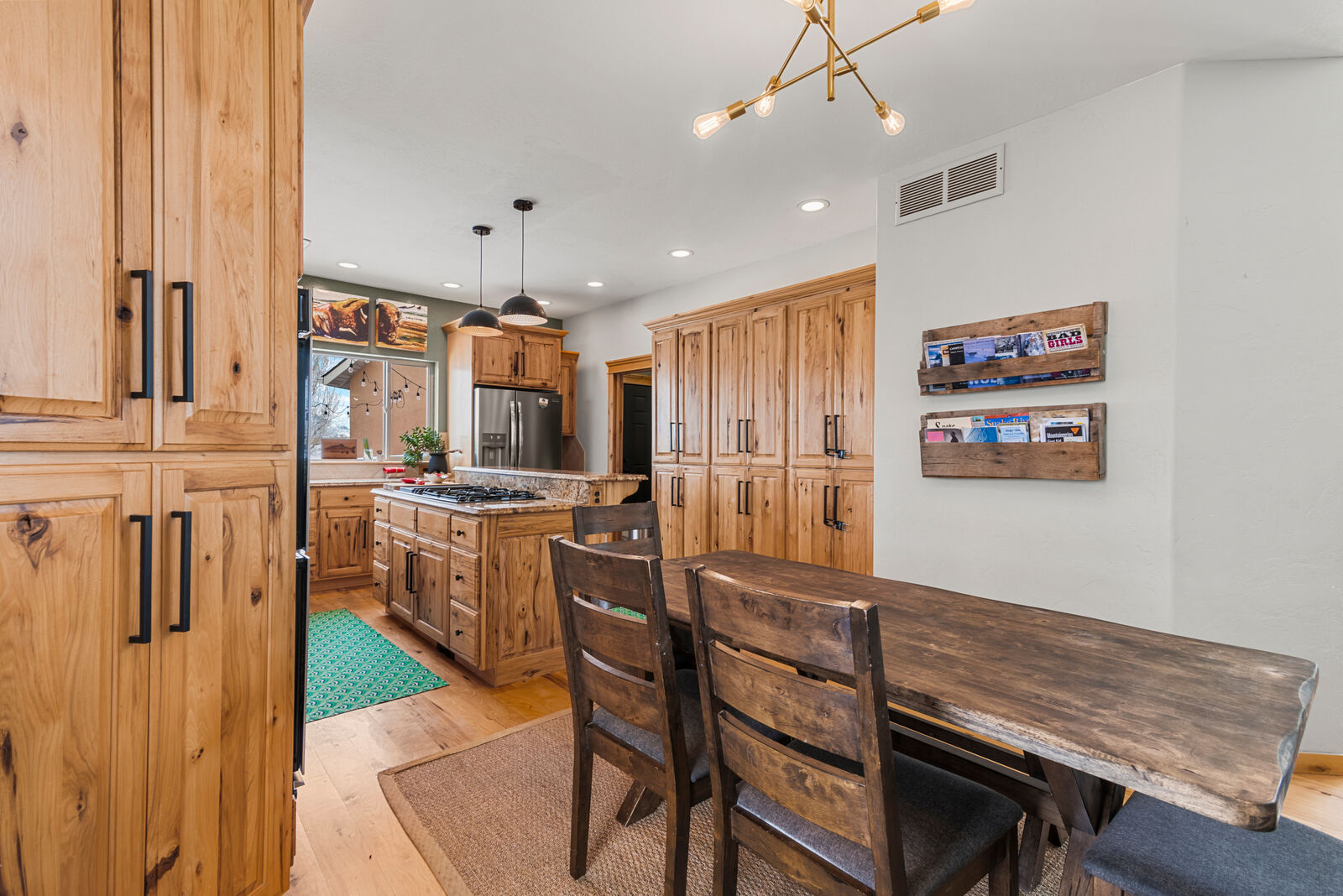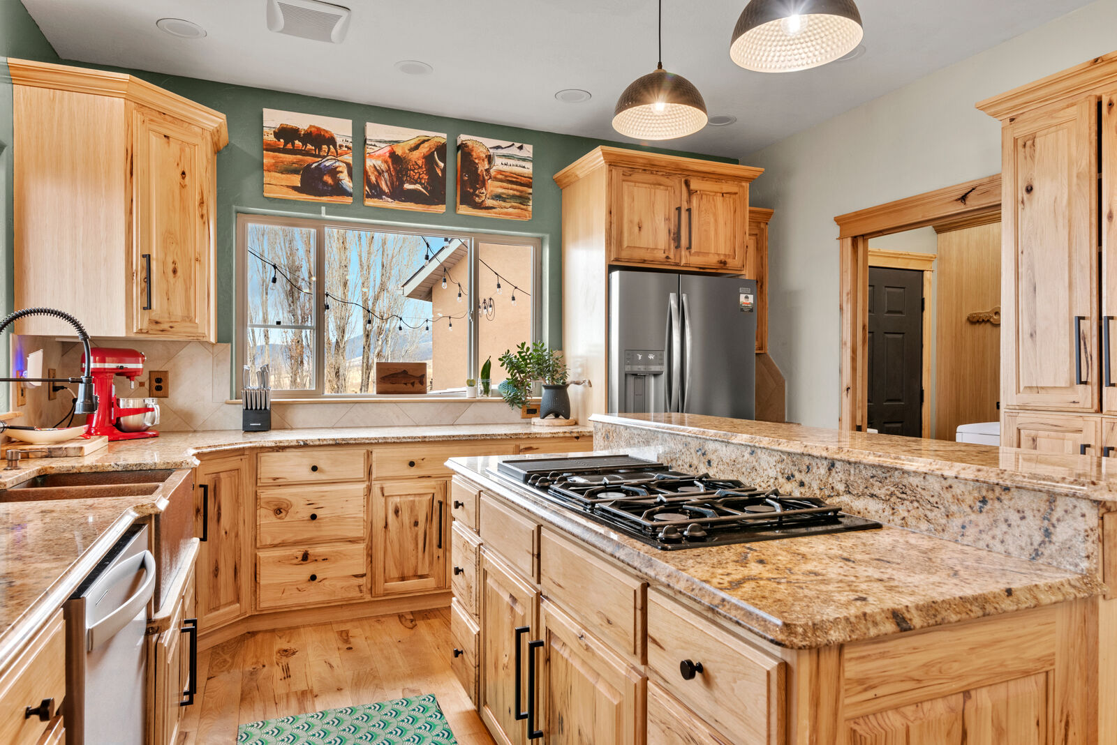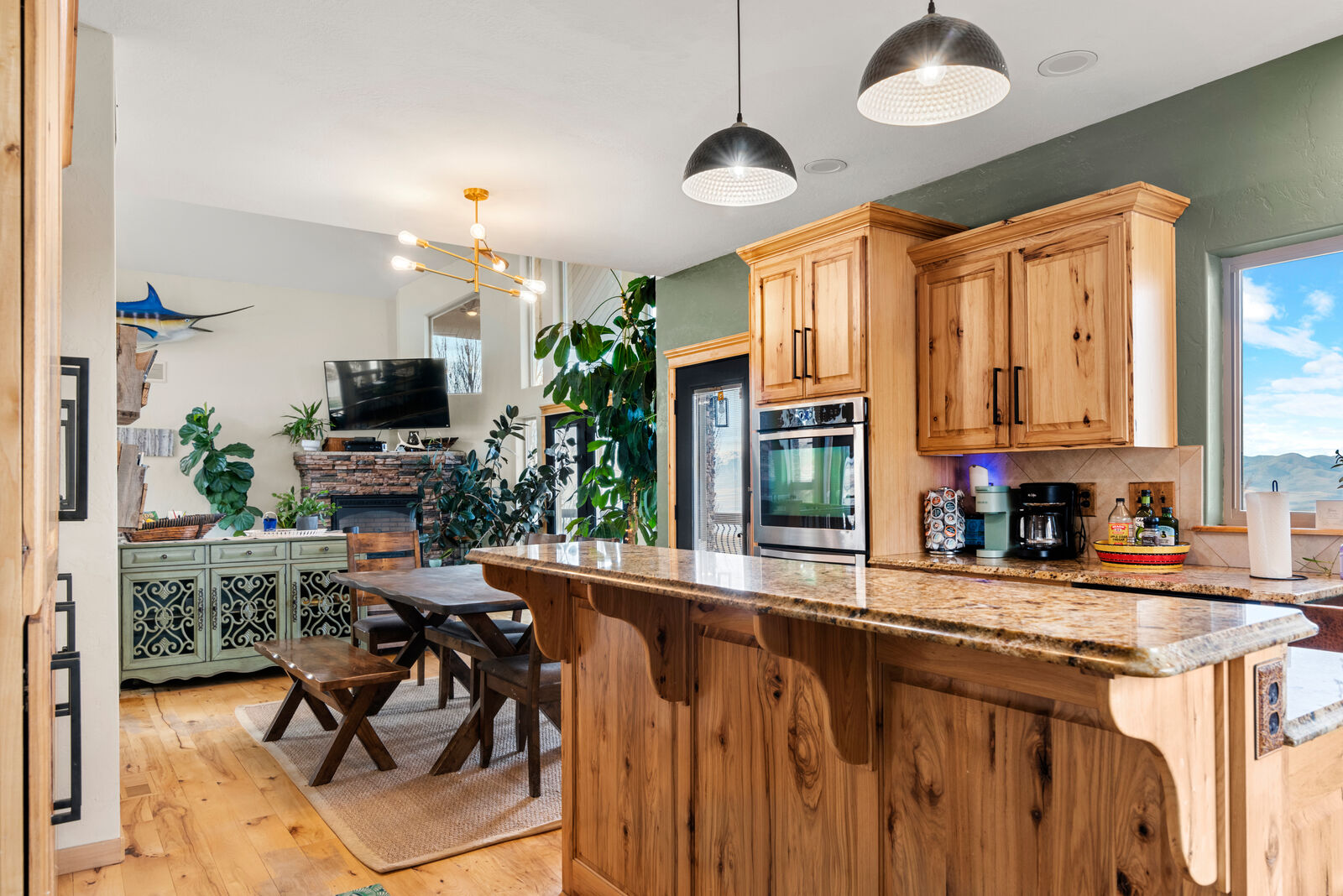The custom built home is designed to showcase its surroundings, featuring soaring vaulted ceilings, expansive windows, and warm hickory hardwood floors and trim throughout. With 5 bedrooms, 3 bathrooms, a flexible office/exercise space, mudroom, and a spacious three car garage, the layout is ideal for both everyday living and hosting family or guests.