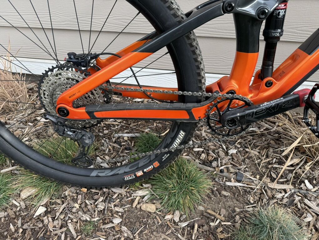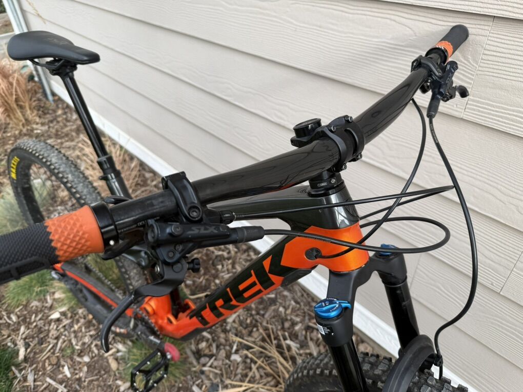 In frame storage Carbon frame Carbon bars, Carbon next cranks Fox suspension 130 rear 140 front Fox 34 fork SLX/Xt drive SLX brakes Dropper post New race face wheels and maxxis tires