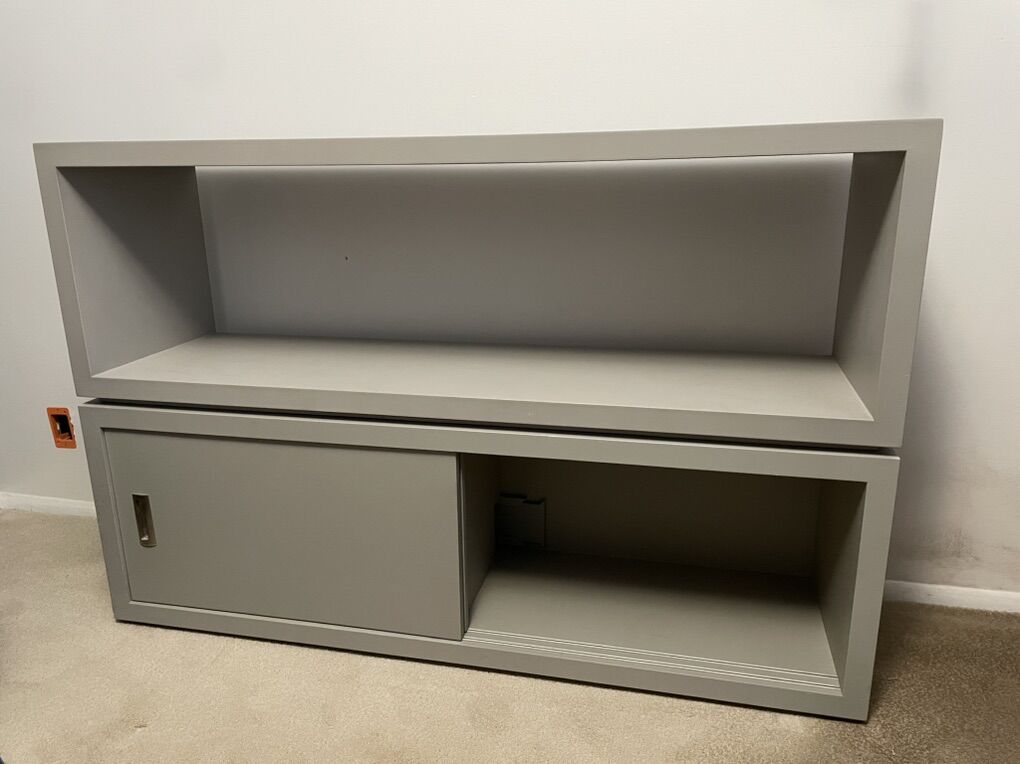 Crate and Barrel entertainment center. Two pieces … can be used individually or together. One unit is open while the other has two sliding doors. Tons of storage for equipment.