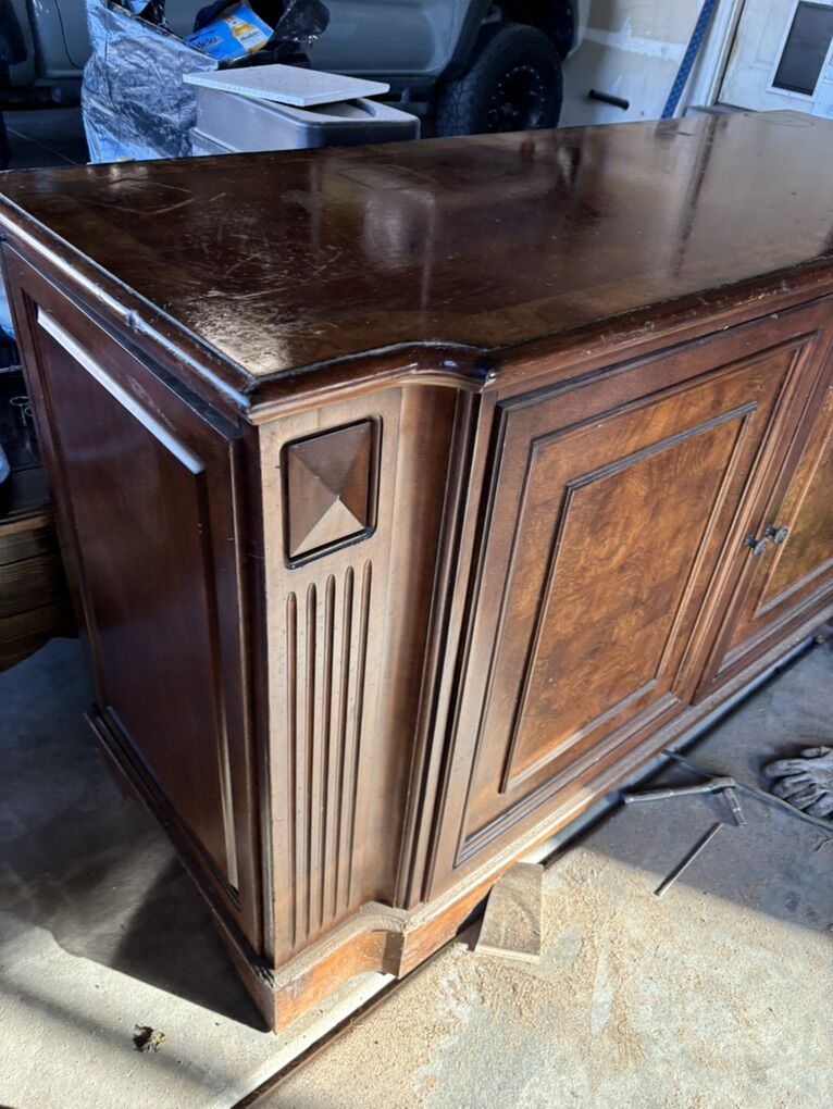Free TV stand/ storage. 36in tall x 64in long x 24 in deep, Free need gone, dogs chewed bottom corners a Little added pic I you want it bring help to load it is solid and fairly heavy.
