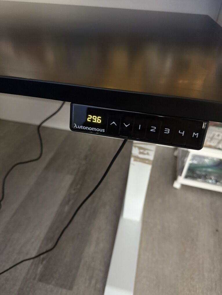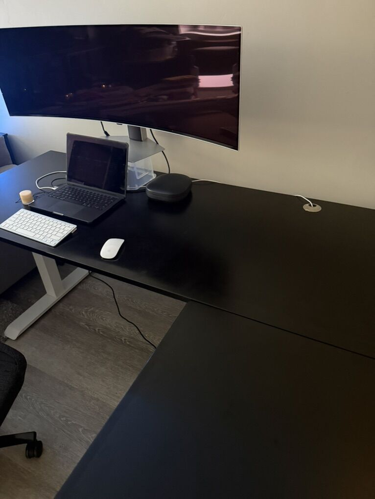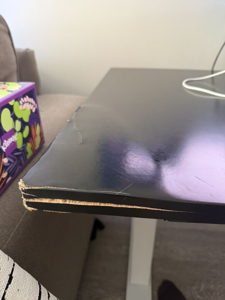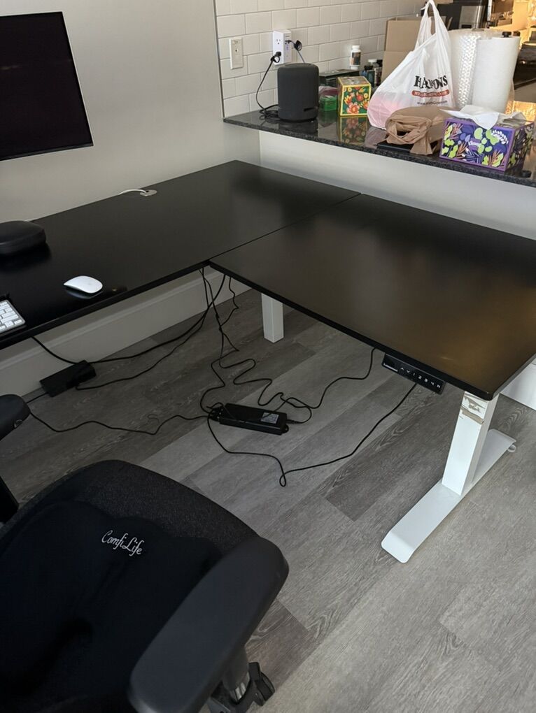 ZelleLarge, L-shaped standing desk (64’ x 77’). Originally $1,200 back in 2022. Fully functional (see video), but one corner was damaged in my last move (see photos).