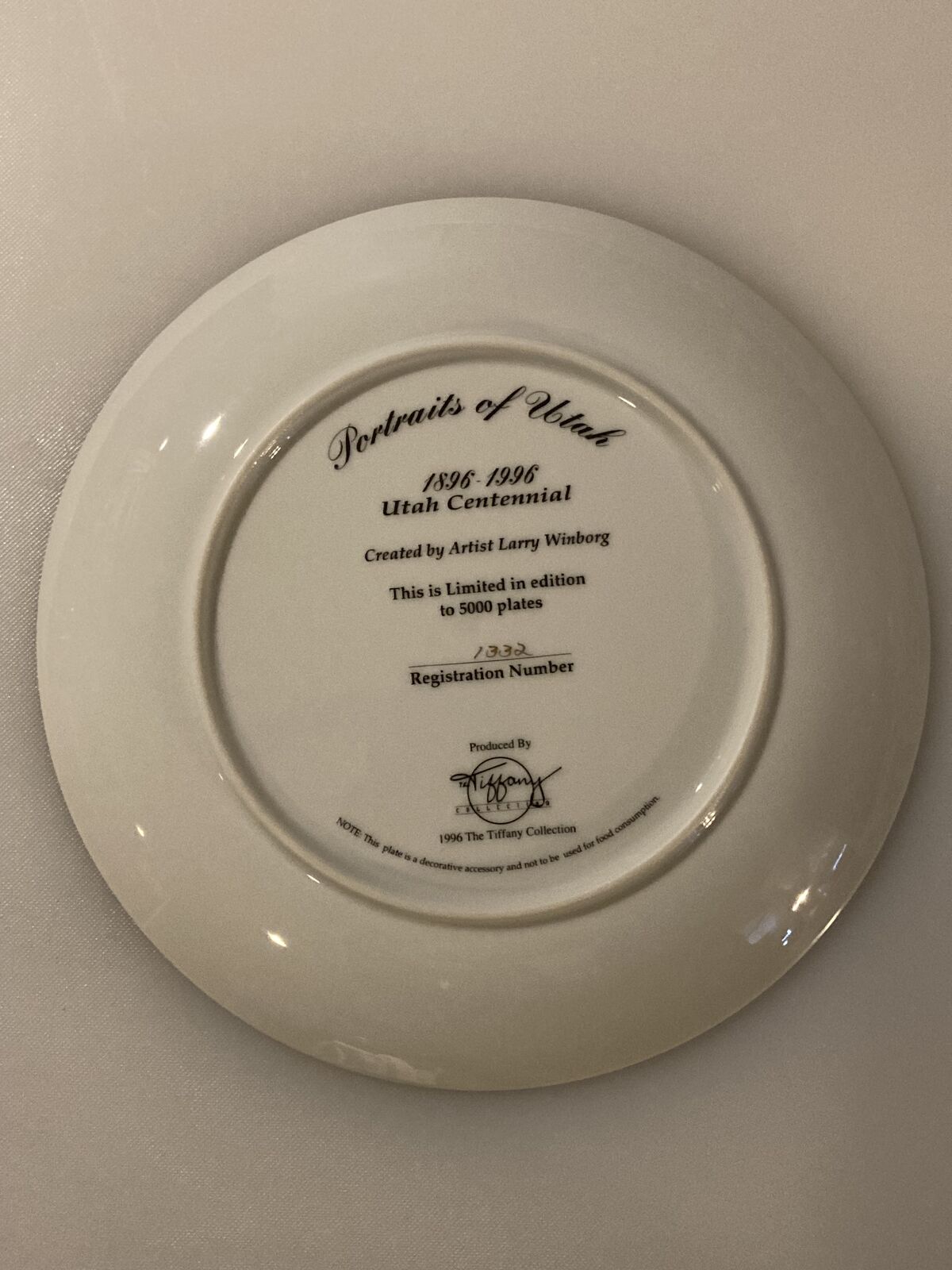 ZelleFrom The Tiffany Collection's limited edition Portraits of Utah plate collection - a beautiful creation by artist Larry Winborg entitled "1896 - 1996 UTAH CENTENNIAL".