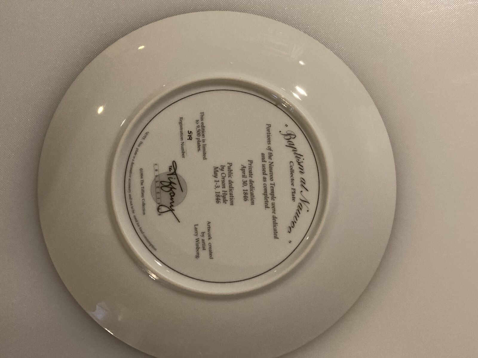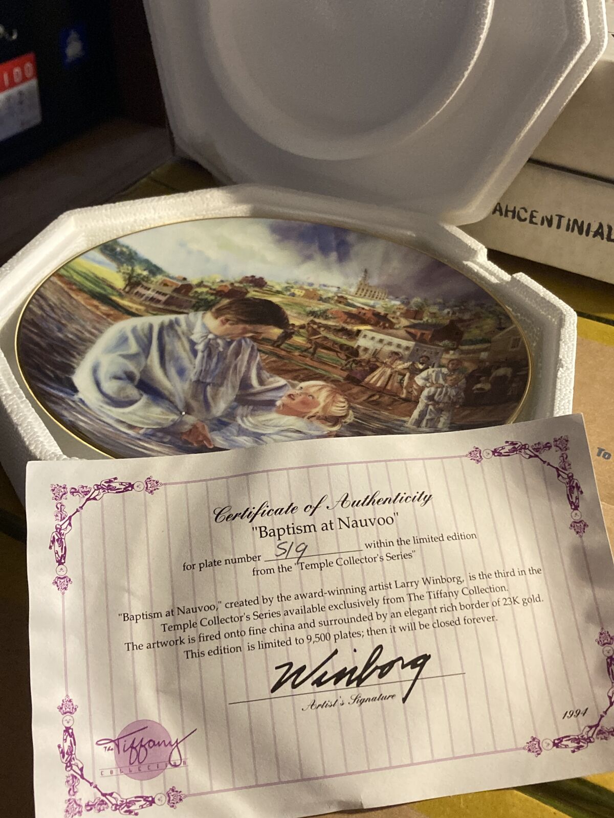 ZelleA limited edition collector plate from The Tiffany Collection: "BAPTISM AT NAUVOO" by award-winning artist Larry Winborg.