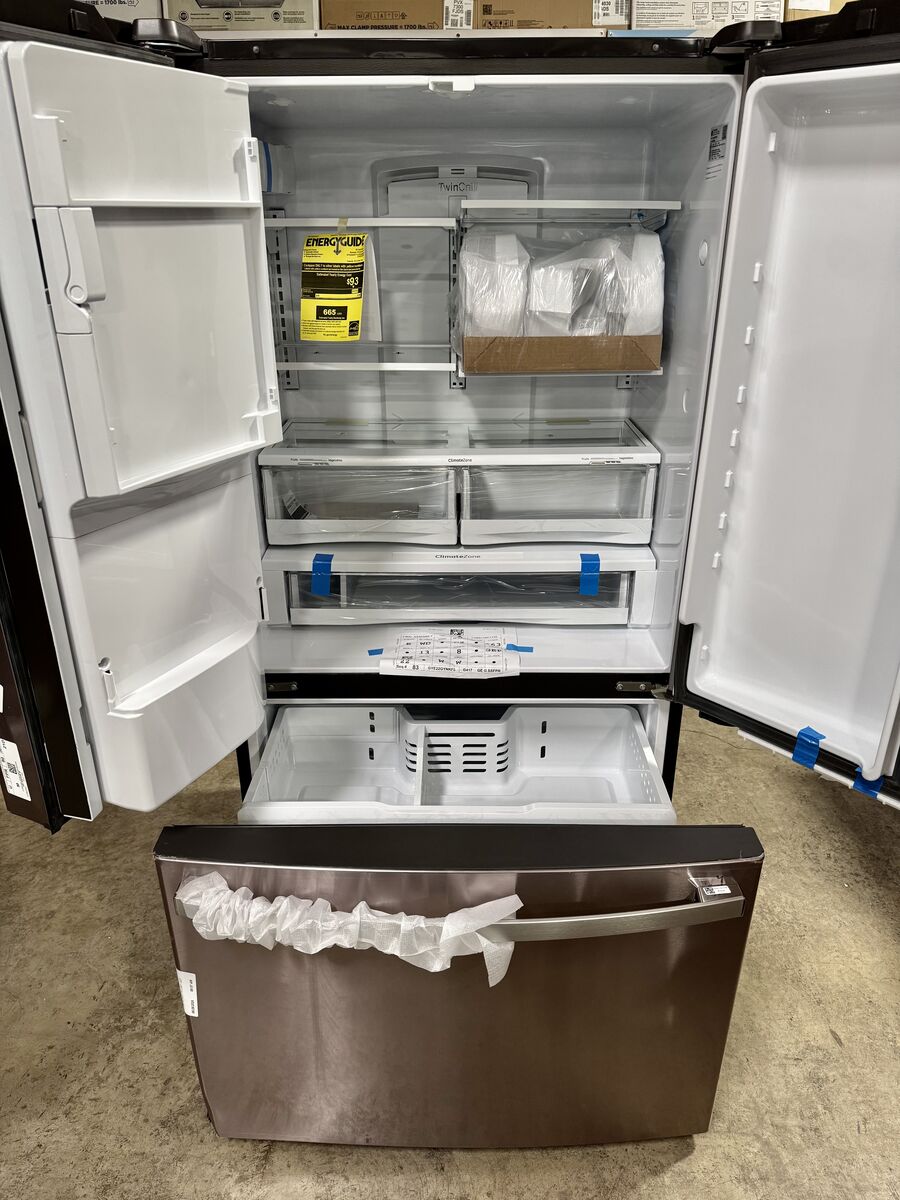 GE 36 Inch Counter Depth French Door Refrigerator with 22.2. Cu. Ft. Capacity, TwinChill, Showcase LED, Enhanced Shabbos Mode Capable, External Filtered Water/Ice Dispenser, ADA Compliant, and Energy Star Qualified: Fingerprint Resistant Stainless Steel