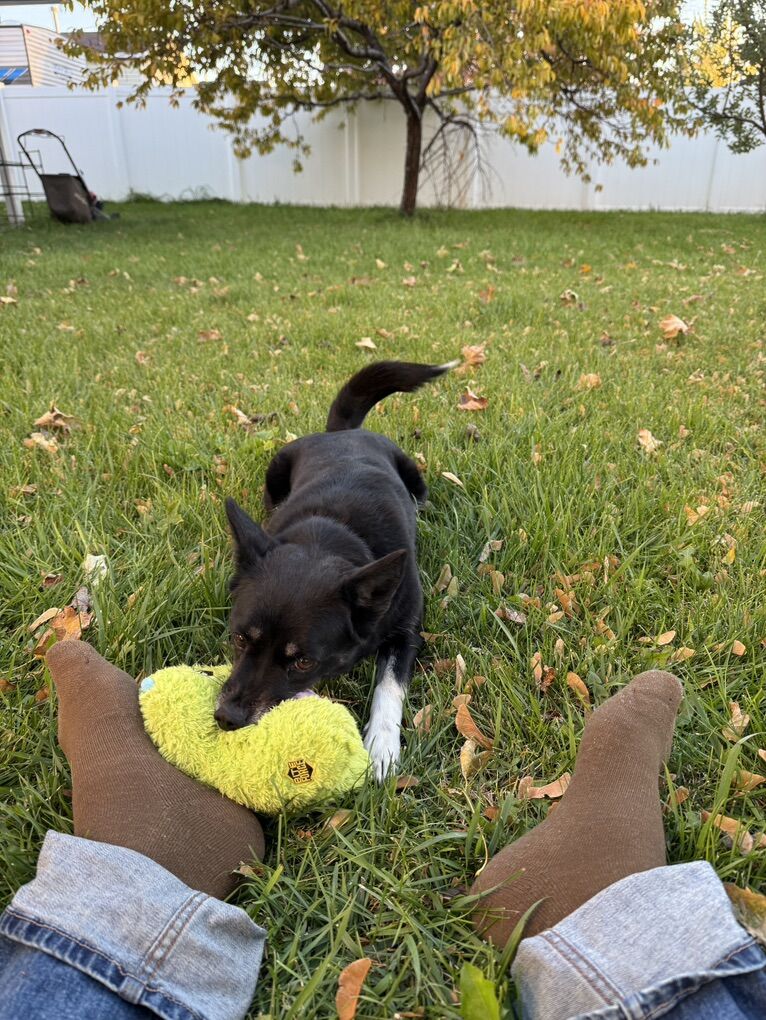 6 year old intact female 21lbs. House and doggie door trained. Comes with crate and toys.