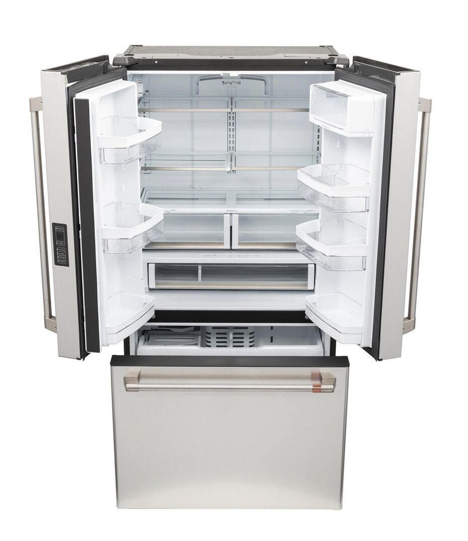 This is a gorgeous Cafe 6 Inch Counter Depth French Door Smart Refrigerator with 23.1 Cu. Ft. Capacity, TwinChill™ Evaporators, Temperature-Controlled Drawer, Wi-Fi, Internal Water\Ice Dispenser, and ENERGY STAR®: Stainless Steel with Brushed Stainless Handles