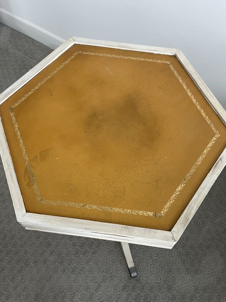 ApplePayNot sure the age, but it’s in good condition. It would be fun to use for any type of decorating. It has been repurposed. It has some minor scratches on it. It is a hexagon shape with a creamy off-white paint, antique distressed look, and then the yellow gold top. It is 26 inches high and 2 feet across smoke free pet free home pick up in Ogden or I can arrange to bring down to Sandy. Please text 801-831-3382 and check out my other items.!