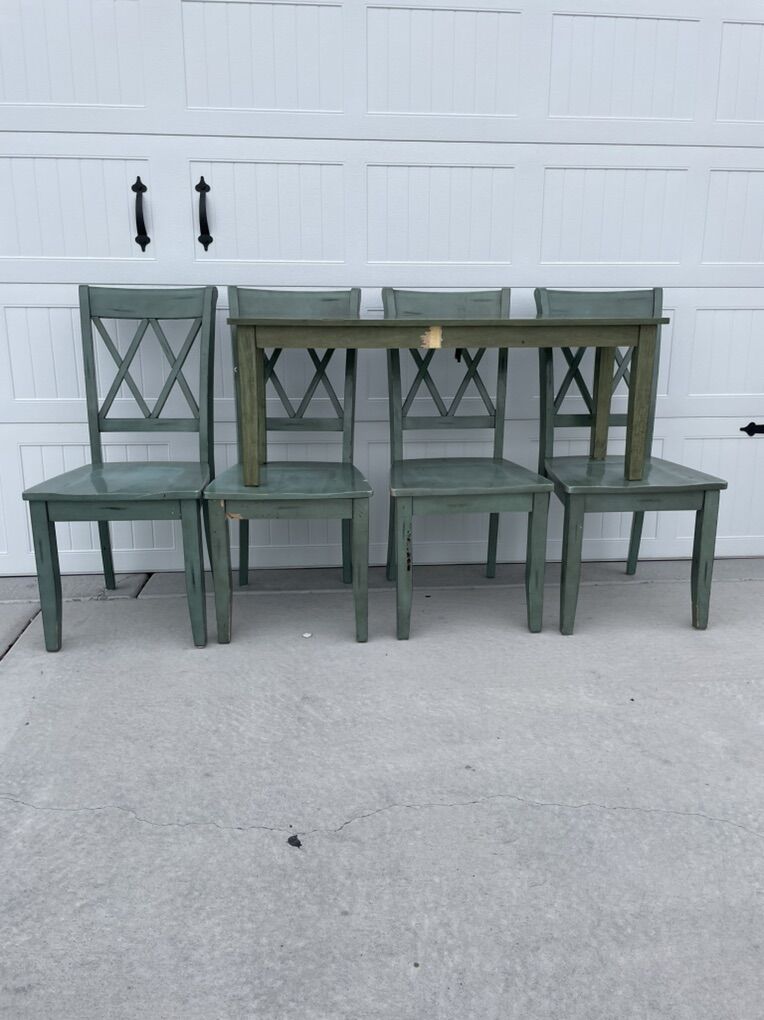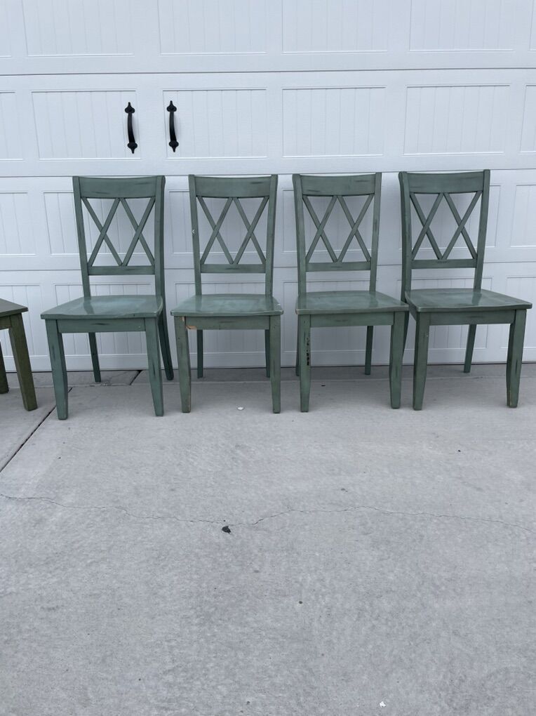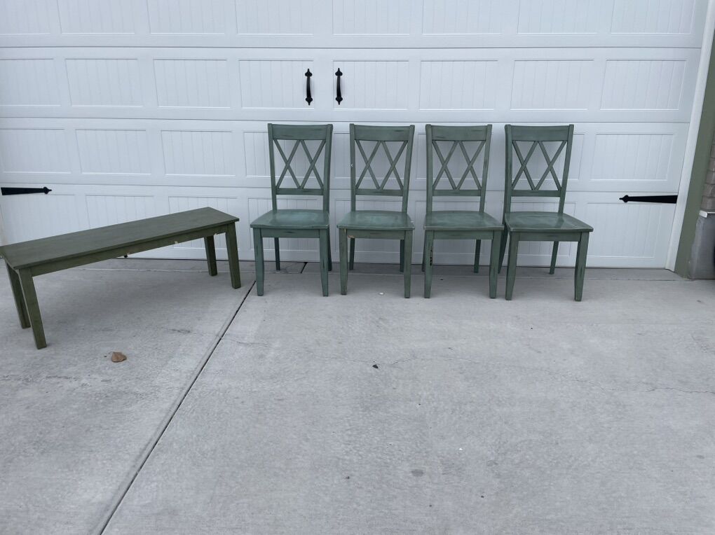 4 farmhouse green x back dining chairs + 1 bench Has cosmetic chips and one chair is missing a piece of wood (see video) Work great as-is or would be pretty painted Could use tightened and wiped down $60 for set in Tooele. FCFS.