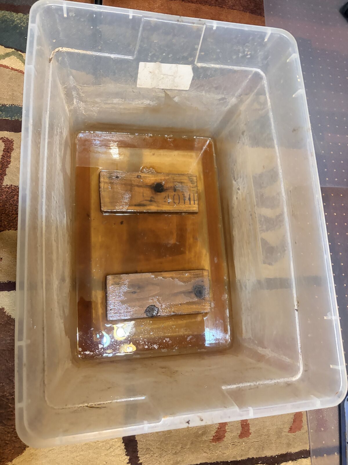 Bottom bin elevated with wood supports to allow easy compost water collection