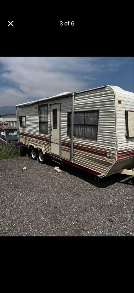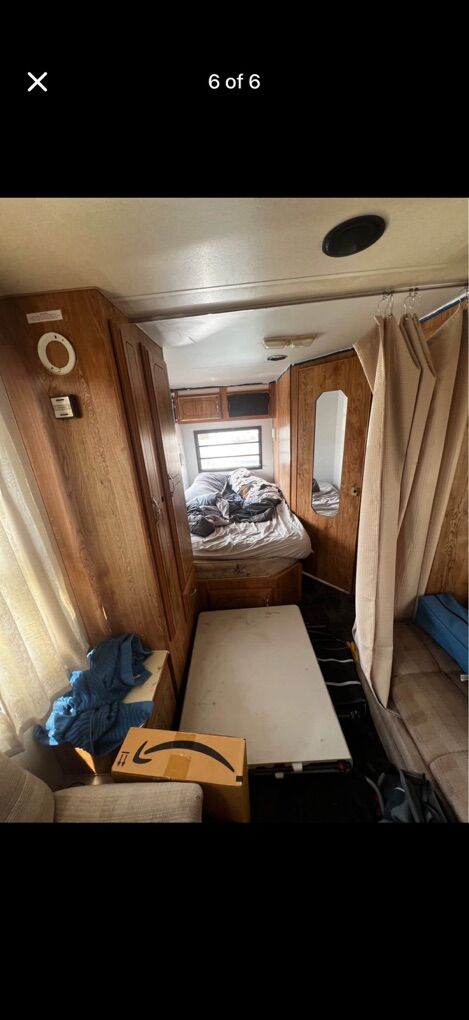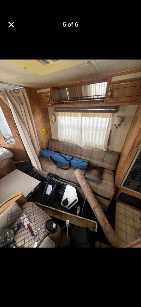 VenmoCamper is in good shape, everything works besides the AC unit in the ceiling. Currently winterized. Does have some damage to the front right corner of the camper but does not leak. Has a full size bed, shower, toilet, couch that turns to bed, table that turns to bed, and a kitchenette. Comes with dual propane tanks and brand new leveling jacks. Tires will roll and hold air but are showing dry rot so need to be changed before taking on a road trip.