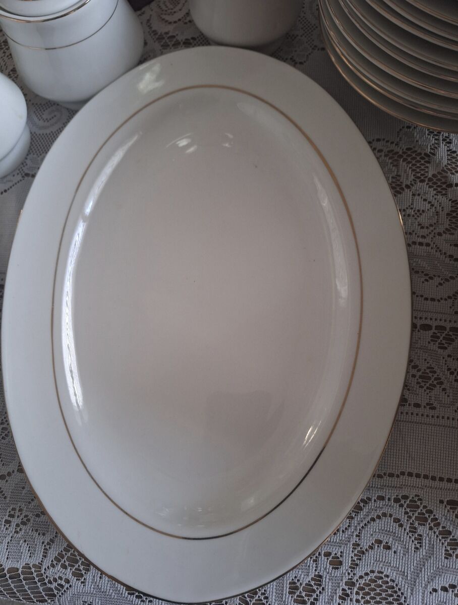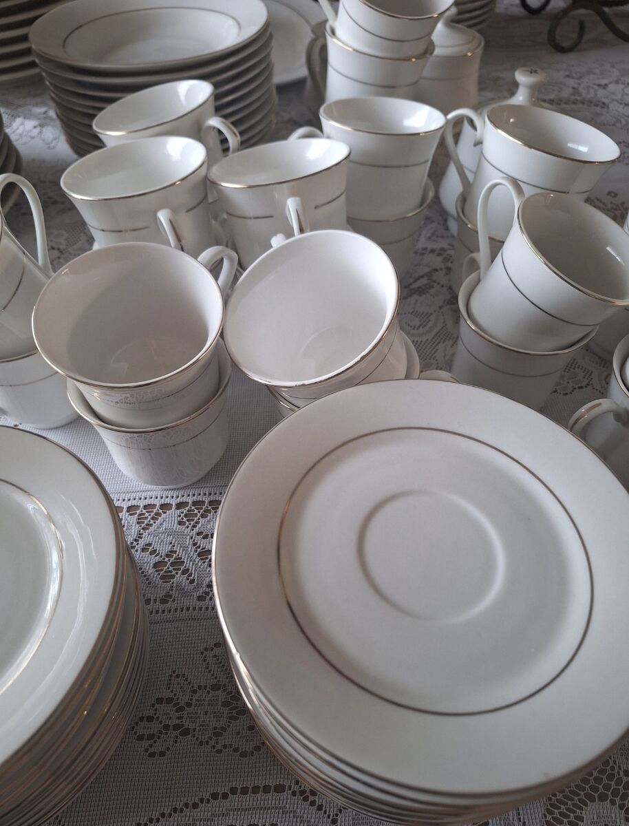 Farberware China Simplicity Gold with Gold Trim. Service for 16. Includes 16 lunches plates, 16 dinner plates, 16 coffee cups, 16 saucers, 16 salad plates, two creamers, 2 sugar bowls, one bowl, and one platter. Cash only.