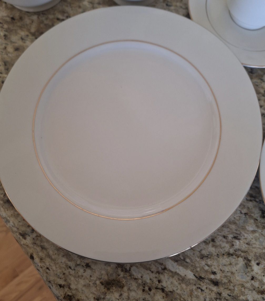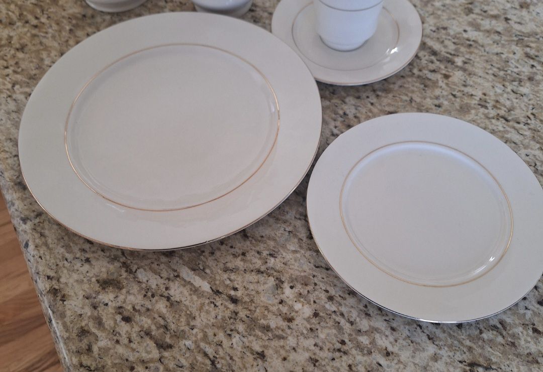 Farberware China Simplicity Gold with Gold Trim. Service for 8. Includes 8 dinner plates, 8 lunch plates, 8 soup bowls, 8 coffee cups, 8 saucers, 1 creamer, and 1 sugar bowl. Cash only.