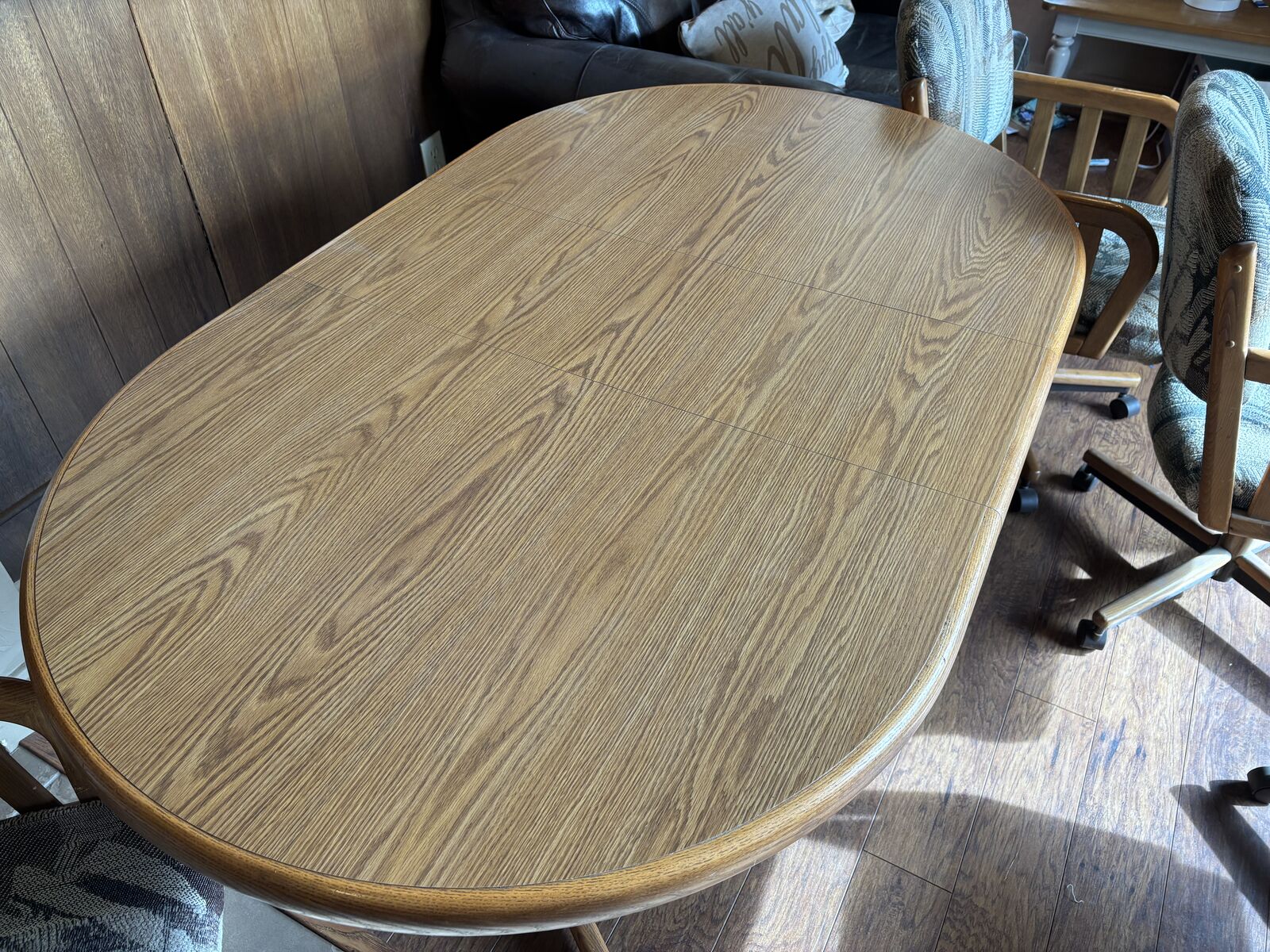 ApplePayKitchen table with 6 rolling chairs. Table is versatil. It can be a round table or with the leaf as shown it is oblong shaped.