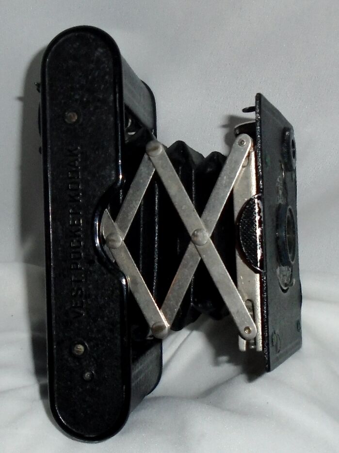 The vest Pocket Kodak is an early compact folding camera introduced in 1912 by Eastman Kodak. Designed to fit neatly into the users pockets and later heavily marketed to British, American, Australian, French, Italian, and other Allied soldiers during World War I, the vest Pocket Kodak was one of the most successful cameras of its day. As befitting a camera of this era has a very limited set of controls. The lens board has no release button as it is simply pulled open.