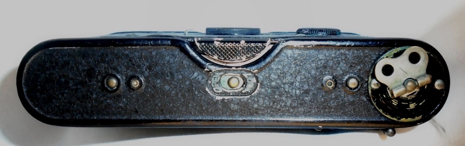 To load and unload film, an entire panel of the VPK can be removed by setting the latch from “lock” to “open”. Once the film and empty take-up are in and the top panel replaced and locked in place, the winding knob is used to advance the film. The oblong red window found on the back of the camera is used as a frame counter (use can see this camera counter has advanced to “44”, as pictured.