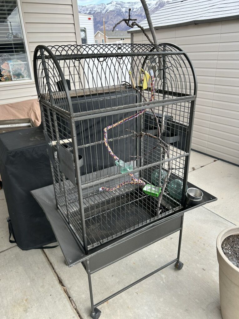Good shape 19” wide, 27” long, 33 tall. Comes with some toys and bowls and rolling stand. Asking $35