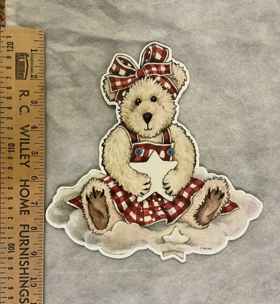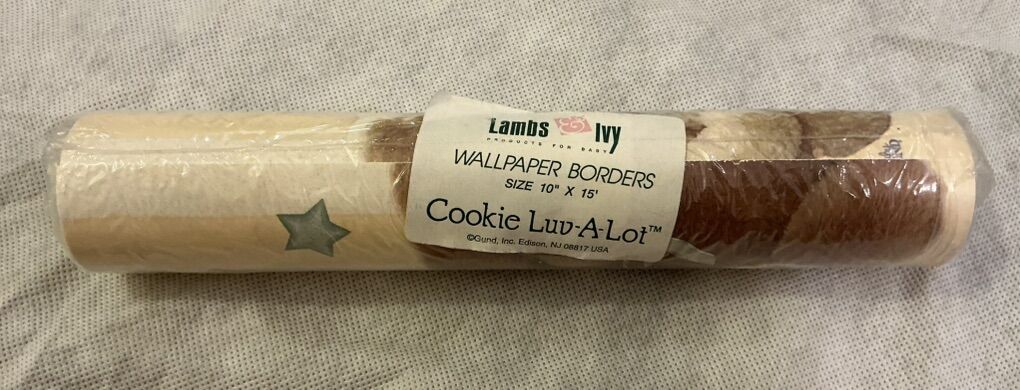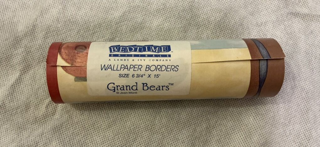Then there are Boyd’s Bears wall hanging cutouts of a crescent moon, on the back there is a button that plays a lullaby after pressing the moon from the front, and we put 2 new batteries in it, so it is ready for you to use! There are also 2 stars, a standing girl bear reaching up to get a star, another girl bear & boy bear are sitting amongst the stars, There are also 2 different wallpaper borders