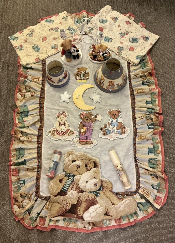 There are: 2 valances, with 1 matching crib skirt, and 1 matching quilted wall hanging. 2 Teddy Bear lamps with lamp shades. 1 with a boy bear at the base of the lamp & a girl bear + a boy bear on the base of the lamp of the other one, with a matching light swtch cover.