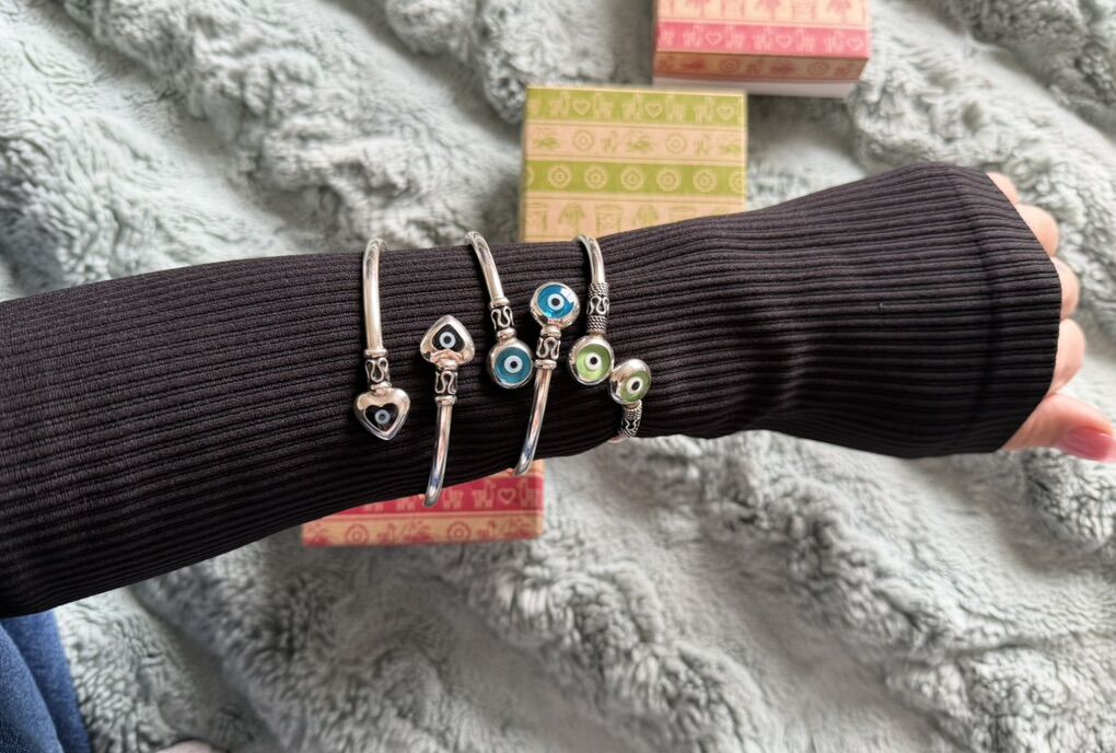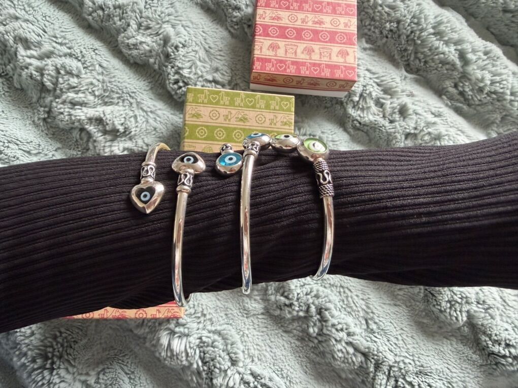 ApplePayBeautifully handmade adult bangle. Featuring an evil eye for protection. This bangle bracelet is made of SOLID SILVER (quite substantial in weight). It is an adjustable style can accommodate wrist sizes form 6 inches to 7.5 inches.