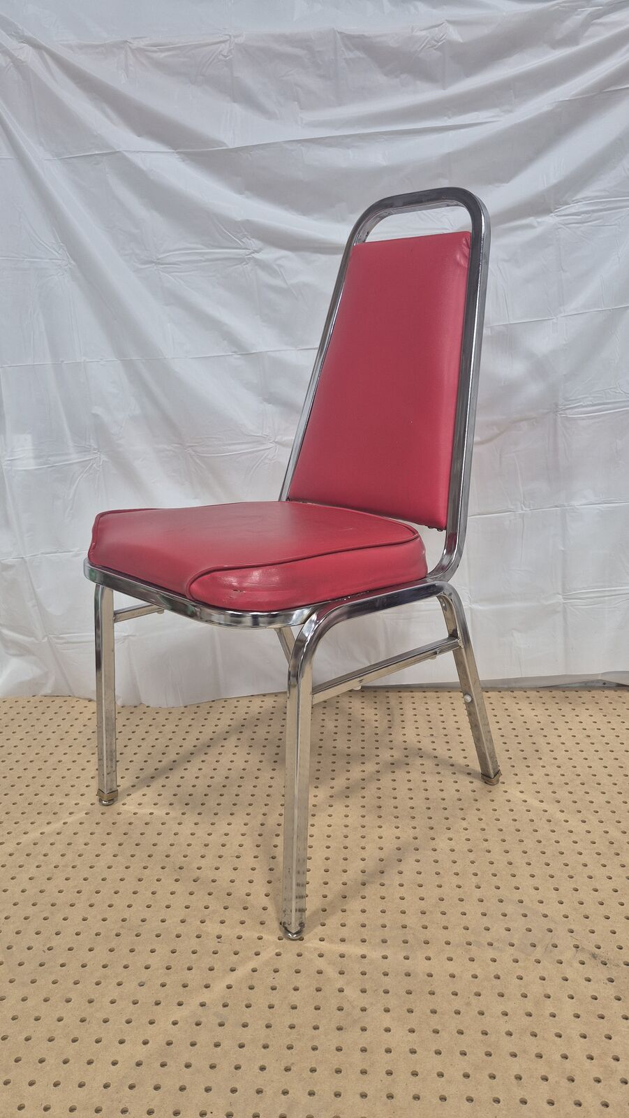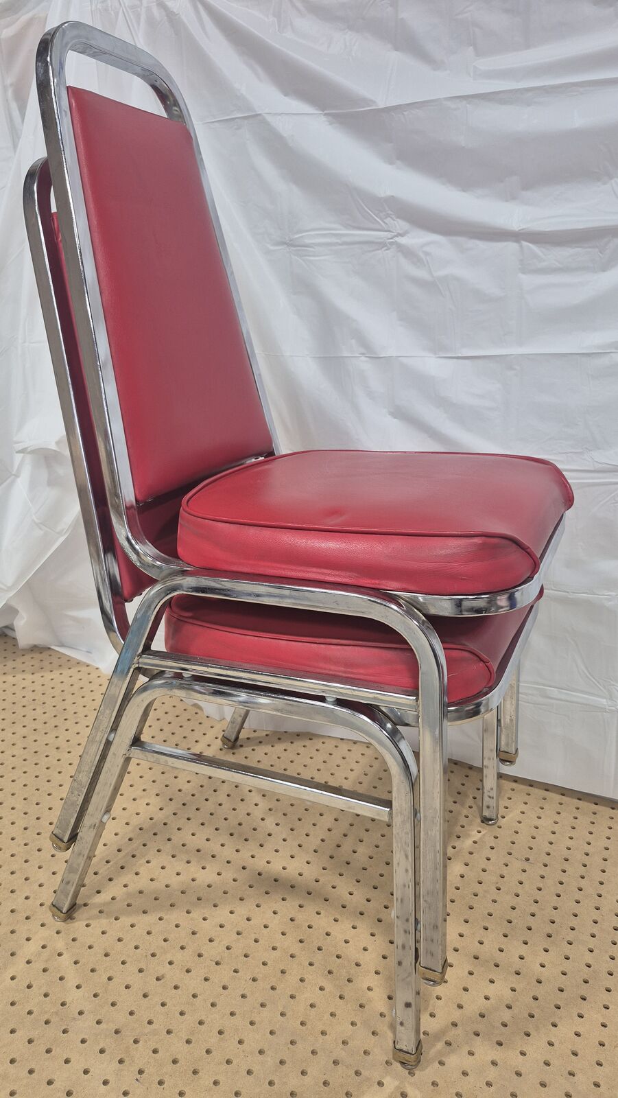 Add some retro character to your space! I have a rare set of 16 matching vintage chairs available. These feature the classic 1940s high-back design with bright red vinyl upholstery and heavy-duty chrome frames.