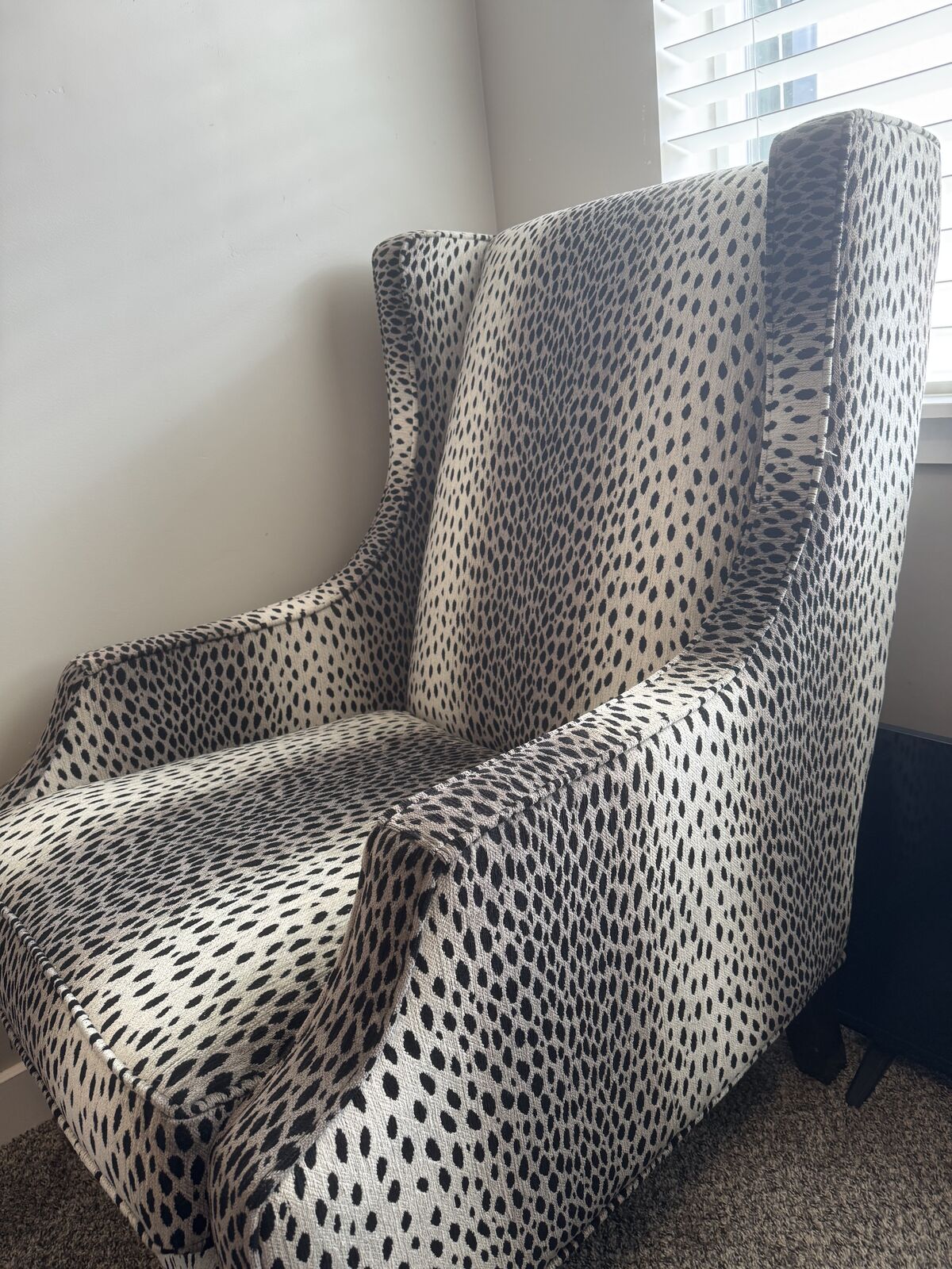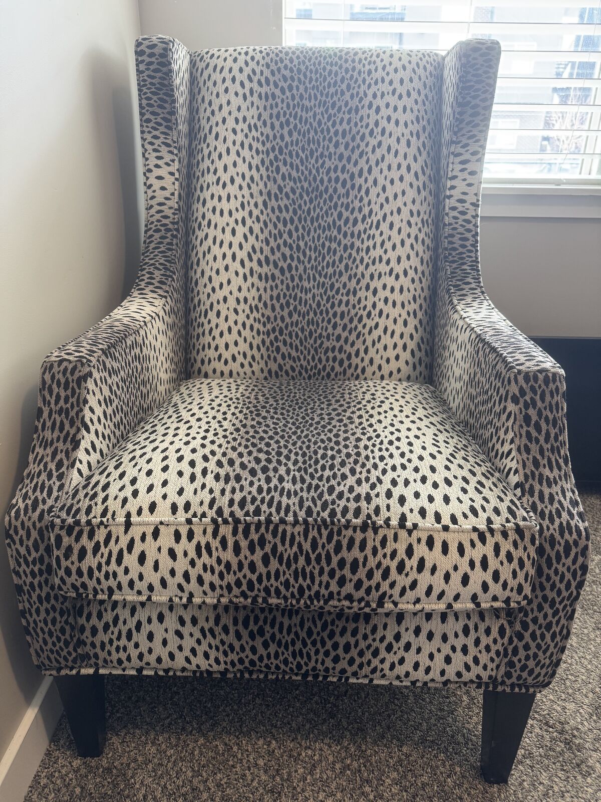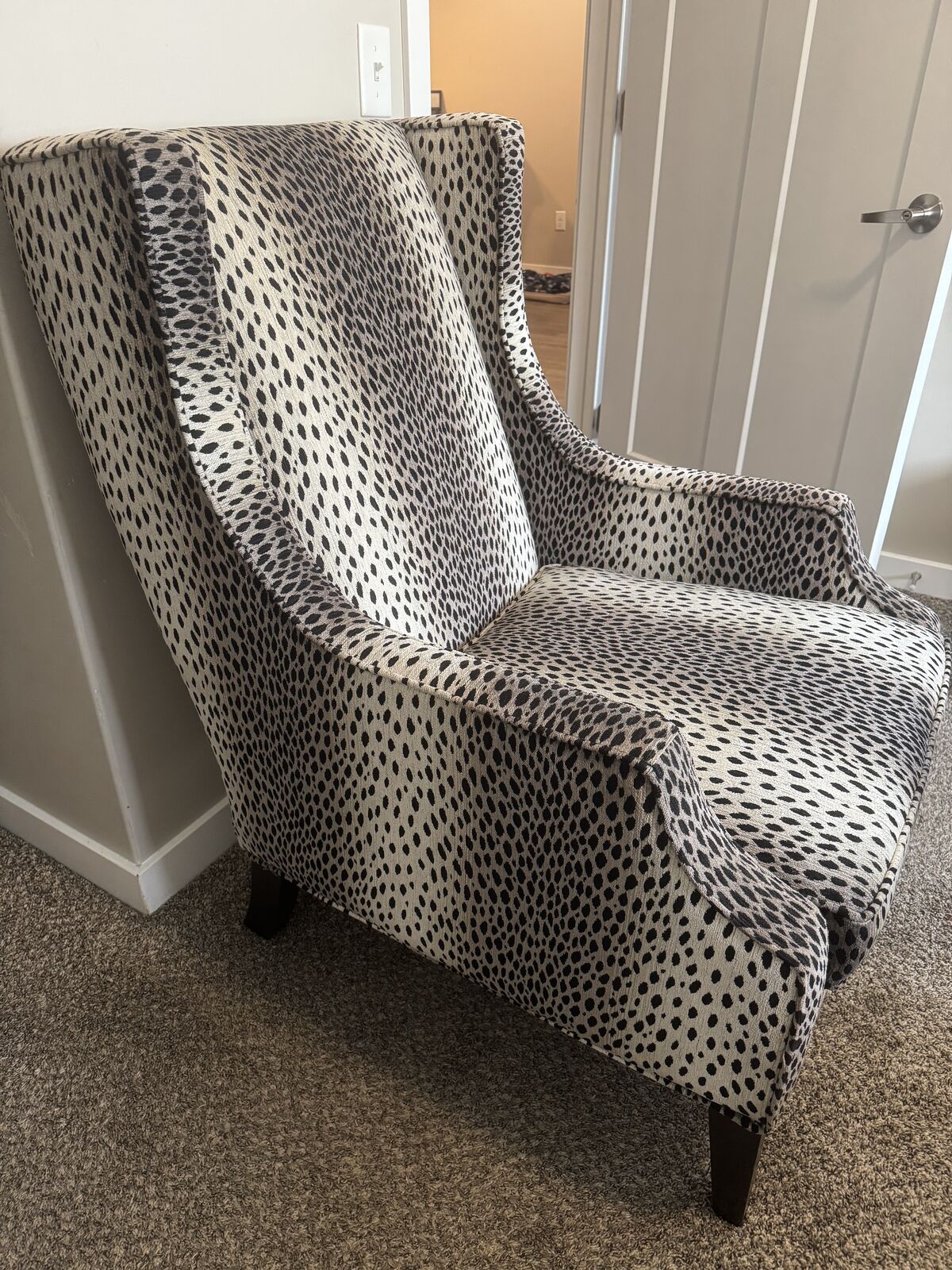 2 Identical leopard print chairs for the living room or study. Soft fabric and NO tears. Very stylish and excellent condition. Minimal leg wear. Dresses up your room! I'm moving. Selling both as pair.