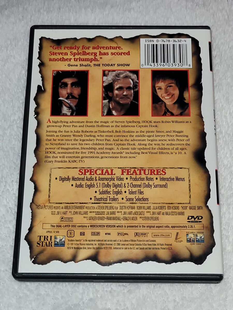 ZelleLike new DVD copy of Hook, the classic Robin Williams film. Disc is clean, case is crisp, and everything is in excellent shape. No scratches, no wear, and plays perfectly.