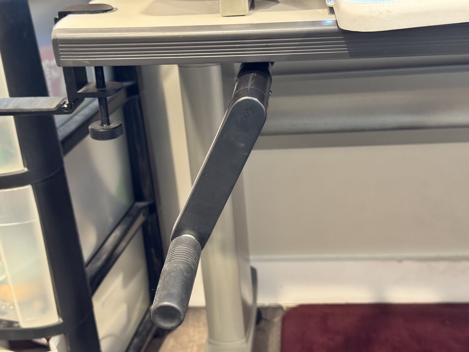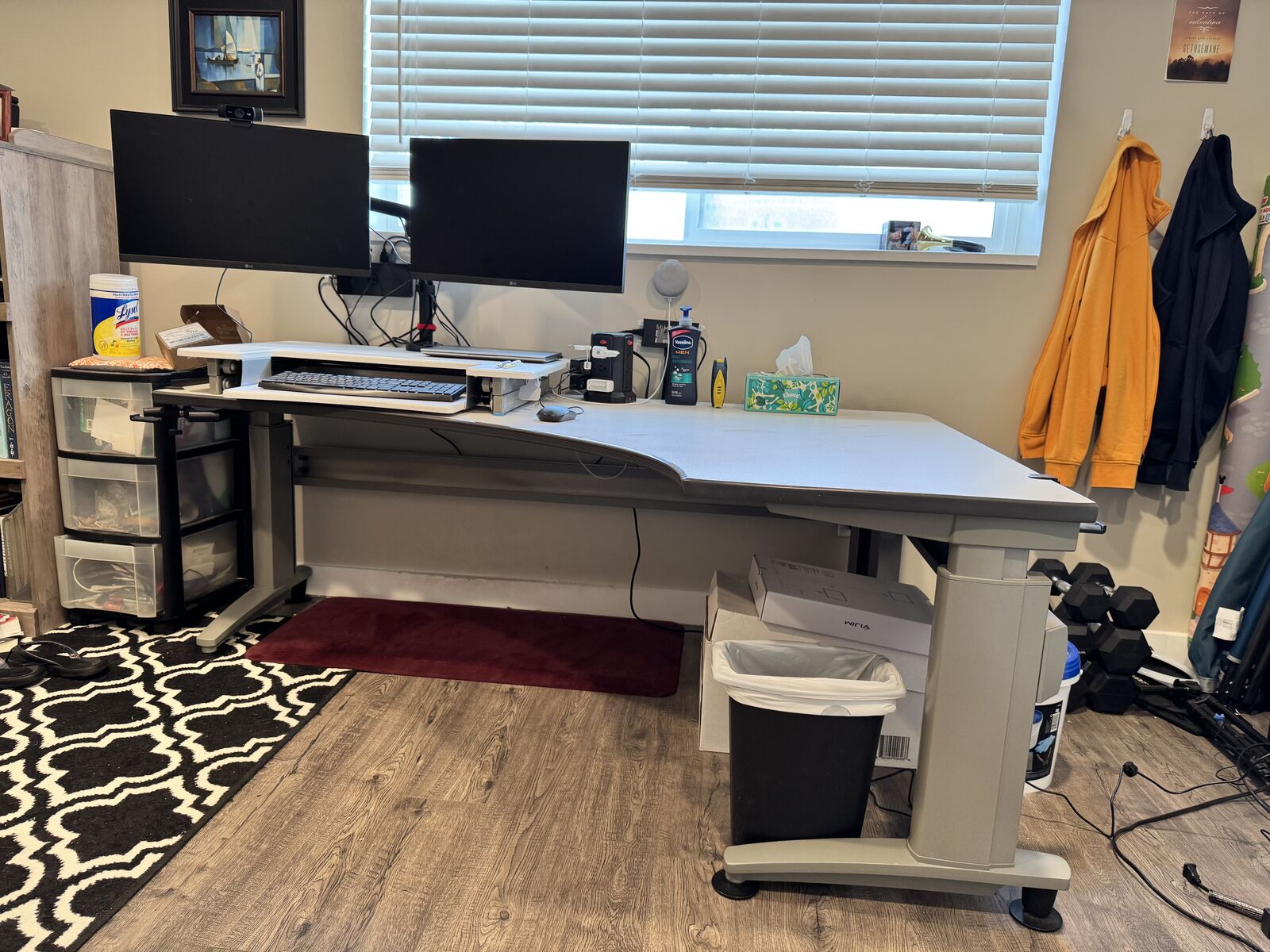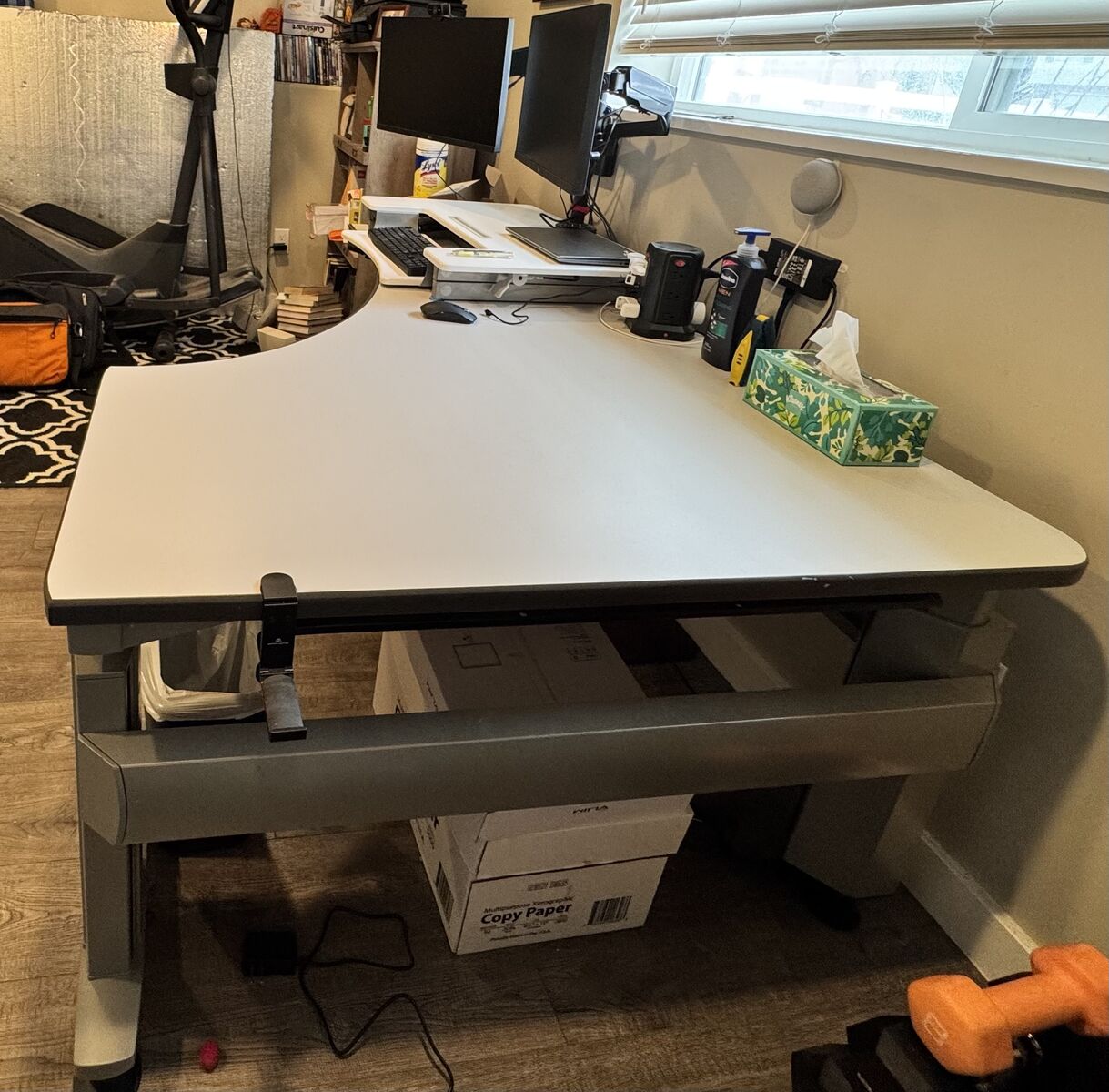 ZelleLarge variable height commercial corner desk. Adjusts as low as 24" and as high as 34". Hand cranks to adjust height. Heavy duty with built in cord management. Standing topper included.
