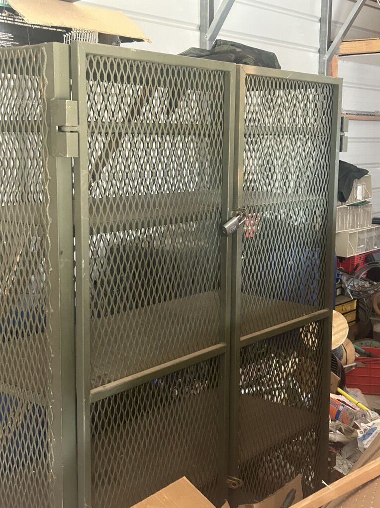 VenmoWas an Army hand gun cabinet with shelves lockable very sturdy and heavy will take minimal two people to lift. Demotions 54”W, 72”H, 25”D.