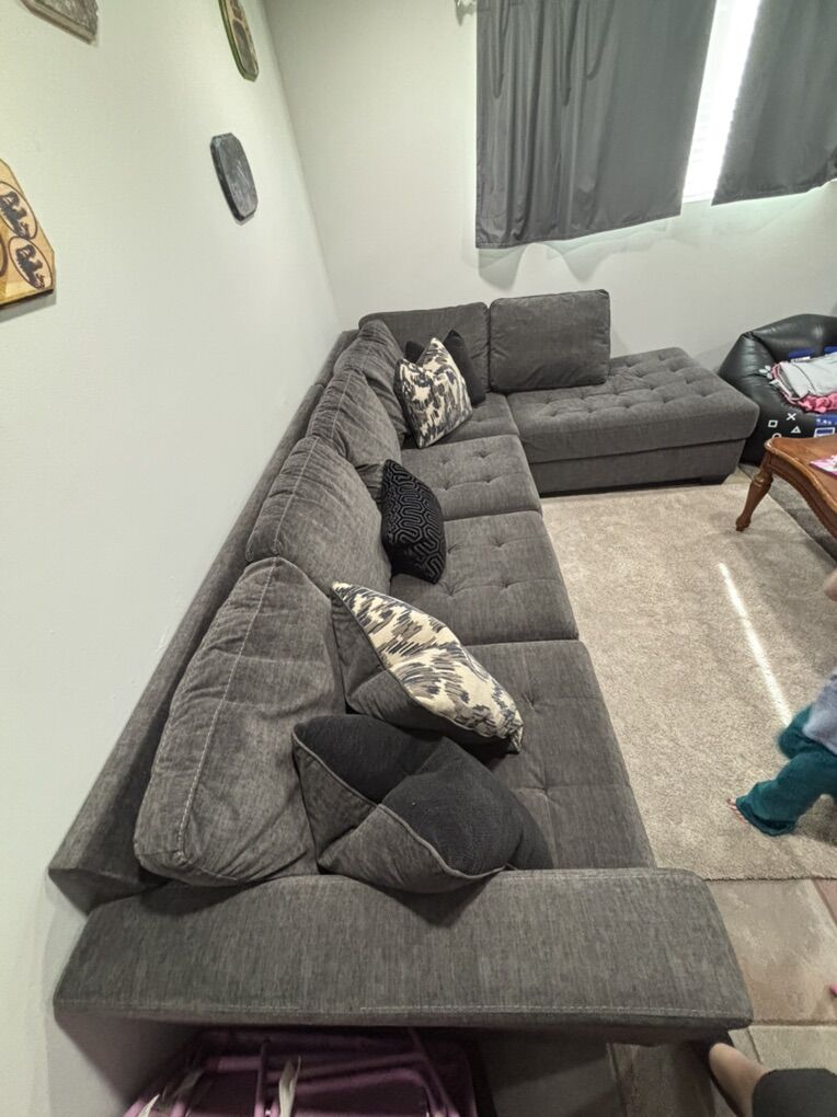 VenmoRight Arm Facing sectional. This is one of the most comfortable sectionals I have sat and slept on. The seat cushions velcro and the back cushion are not attached. Comes in two pieces and you would need to haul away. Couple of small tears in the pillows but nothing crazy. Dimensions are 123x87. $400 OBO