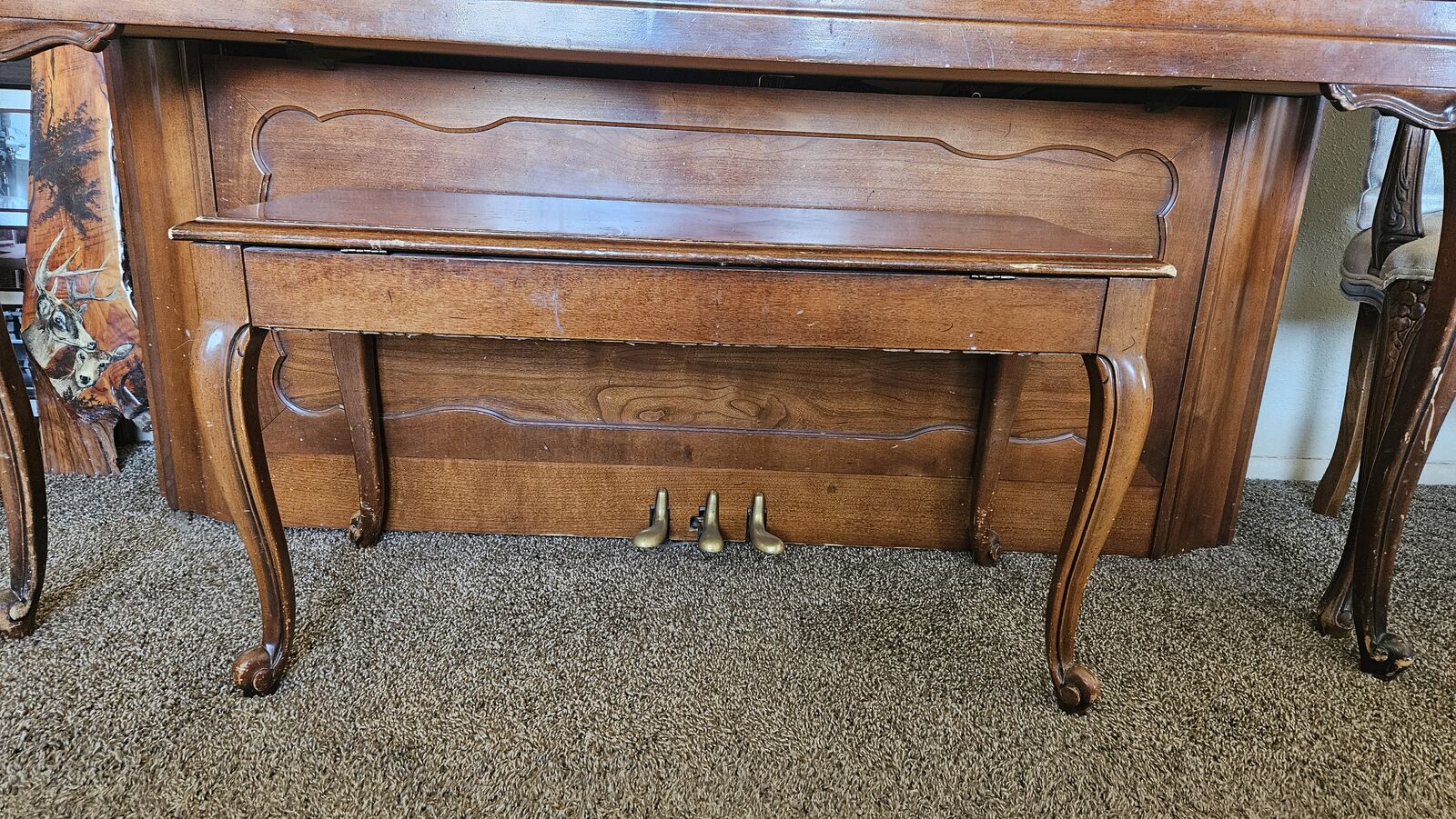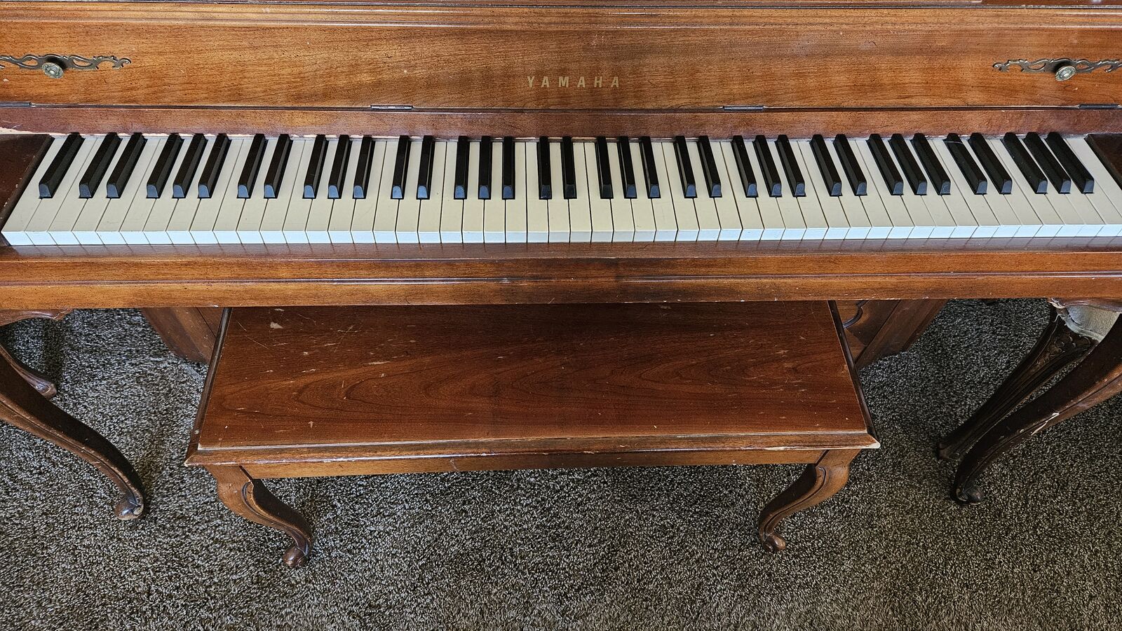 Beautiful Yamaha upright piano in Queen Anne style cabinet with matching storage bench. This is a great statement piece and a solid instrument for someone willing to tune and do light repairs.