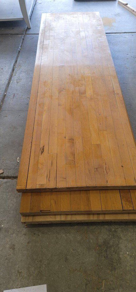 Zelle3 Hardwood planks slabs from an old gym floor 29.5 x 99.5 inches. Each slab has about 3/4" of hardwood on top and underneath is 2 sheets of 7/16" plywood for a total of 1-3/4" thick